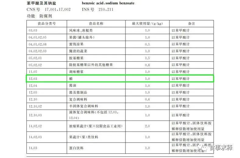 苯甲酸及其钠盐允许使用范围不包括酥鱼(水产品罐头);醋(12.03)允许添加,最大使用量1.0g/kg(以苯甲酸计)。