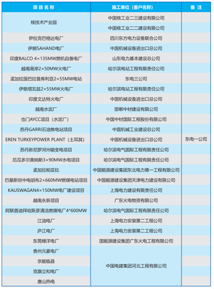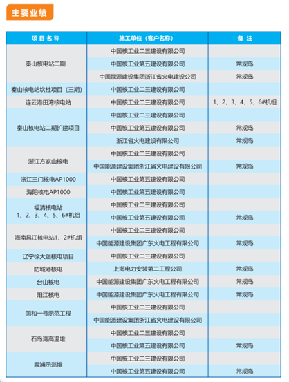凭借过硬的产品和技术,以及上乘的服务,公司先后与中核集团、中国能建集团、东方电气集团、哈尔滨电气集团、中国电建集团和上海电力等央企达成了合作,产品先后用于秦山核电站二期、秦山核电站坎杜项目(三期)、连云港田湾核电站、福清核电、辽宁徐大堡核电项目、三门核电、漳州核电、海南昌江核电、防城港核电、台山核电、阳江核电、国和一号示范工程、石岛湾高温气冷堆、霞浦示范快堆、迪拜哈斯彦清洁燃煤电厂、伊拉克巴格达电厂、伊朗SAHAND电厂、印度文达特火电厂等多个电厂项目。