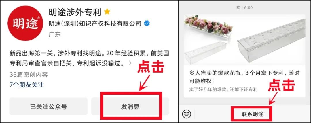 关注“明途涉外专利”公众号→点击“发消息”→点击“联系明途”