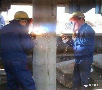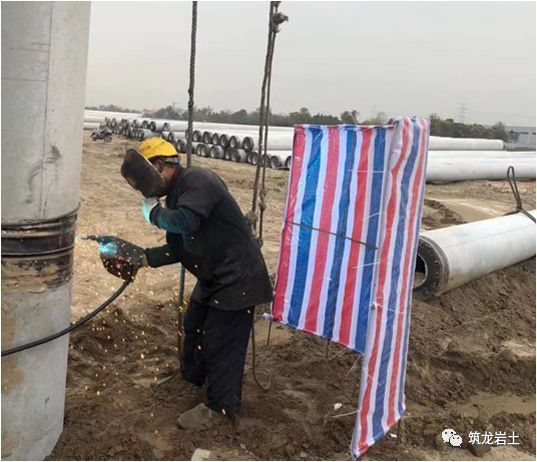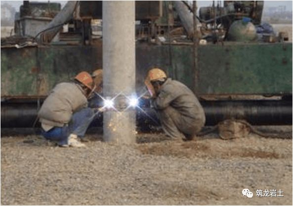 (1)在桩长不够的情况下,应进行接桩,接桩前用钢丝刷清除接头表面的污物和铁锈,上下节之间应焊牢。一般采用电焊接桩,焊接宜在桩四周对称地进行,待上下桩节固定后拆除导向箍再分层施焊;焊接层数不得少于2层,第一层焊完后必须把焊渣清理干净,方可进行第二层(的)施焊,焊缝应连续、饱满;焊好后的桩接头应自然冷却后方可继续锤击,自然冷却时间不宜少于8min;严禁采用水冷却或焊好即施打。