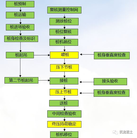 (4)压桩过程中应测量桩身的垂直度。第一节桩下压时垂直度偏差不应大于0.5%;当桩身垂直度偏差大于规范要求时,应找出原因并设法纠正;当桩尖进入较硬土层后,严禁用移动机架等方法强行纠偏。