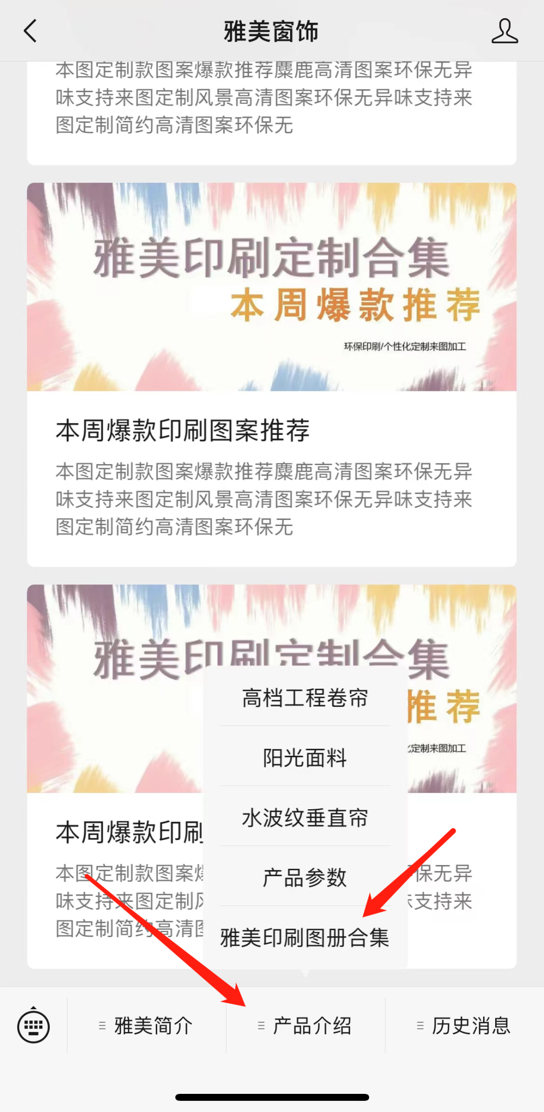 方法二:搜索公众号“雅美窗饰” 列表下方产品介绍点击进入“雅美印刷图册合集”就可以查看最新印刷图案啦。