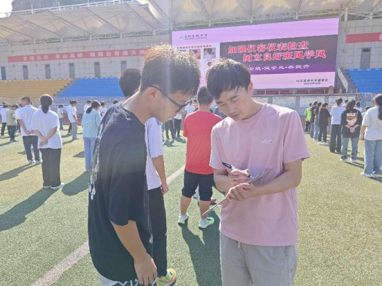 为推进学校精神文明建设,进一步规范学生仪容仪表,9月4日,校德育处、安保处联合年级部利用课间操时间对高一、高二年级学生进行仪容仪表检查。