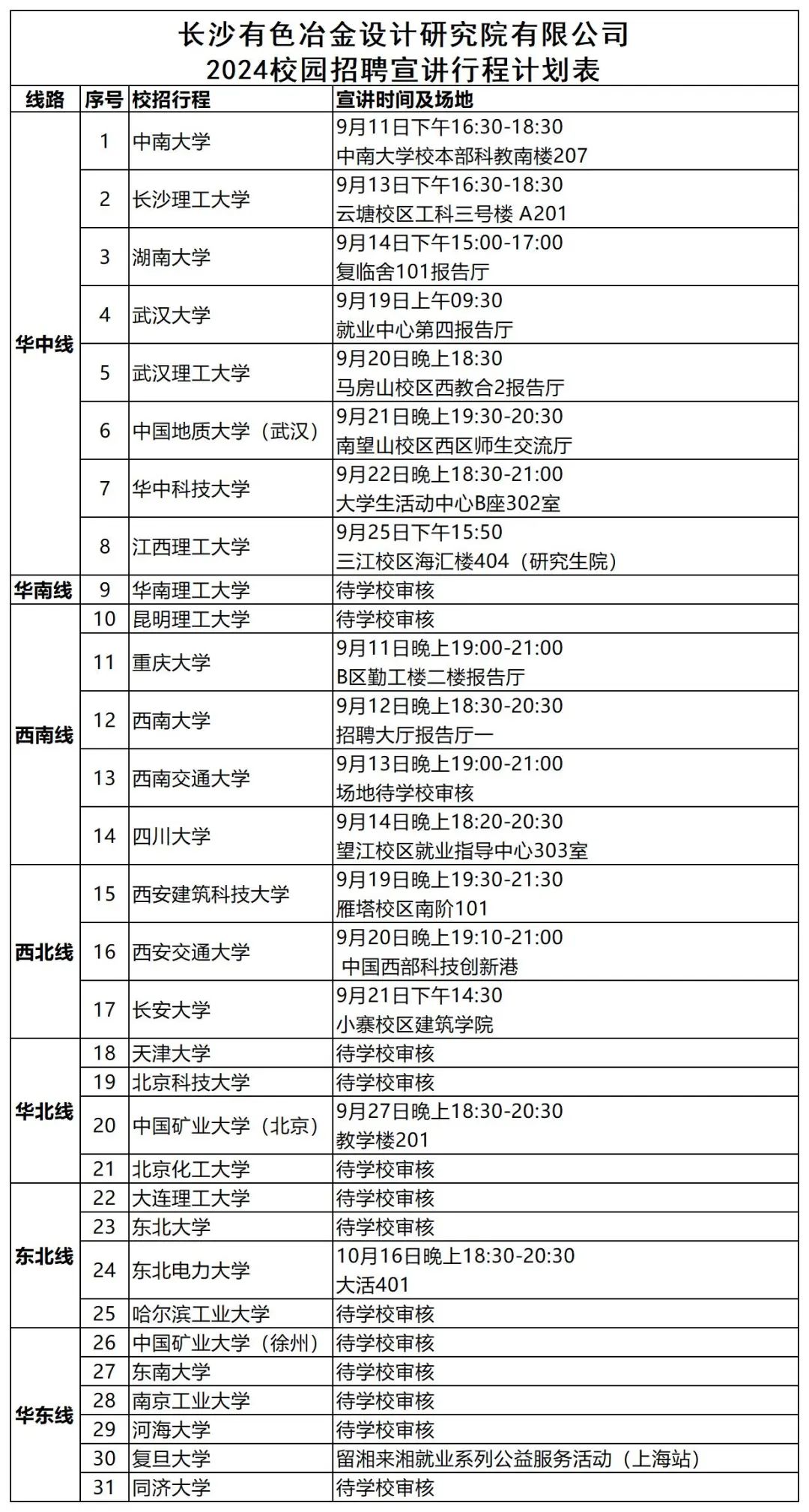 【校招行程】长沙有色冶金设计研究院有限公司2024年校园宣讲行程
