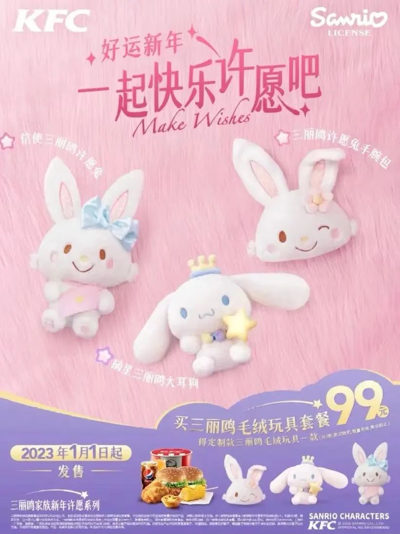 其实早在今年元旦,肯德基就和三丽鸥家族合作过哦。除了人气角色玉桂狗之外,我们的许愿兔Wish Me Mell竟然也有联名产品,泪目了家人们!爱心jio印和背后的彩虹尾巴是我们兔兔的标志性特点了!萌点在线,可爱值100%!怀抱着大耳狗星星灯,直接和温馨感撞了个满怀!狗子手里的星星是可以点亮的哦,真的萌化少女心~还有许愿手腕包,妥妥de少女感时尚单品,甜妹必备!
