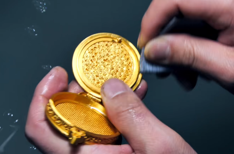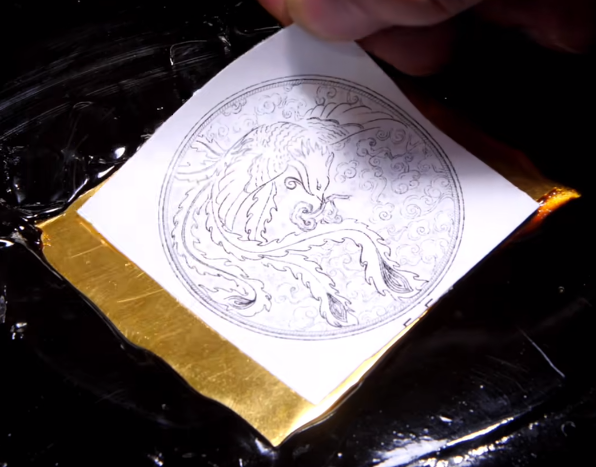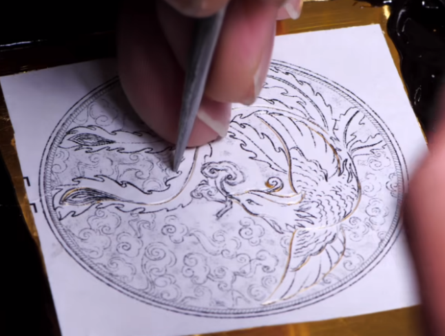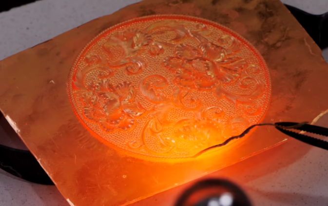 用錾子和锤子沿稿样錾出大形后,加热软化錾刻胶取下金、银片,再将其翻到反面并固定,进行深入敲錾,正反面重复交替錾刻,直至图案层次分明、立体清晰。