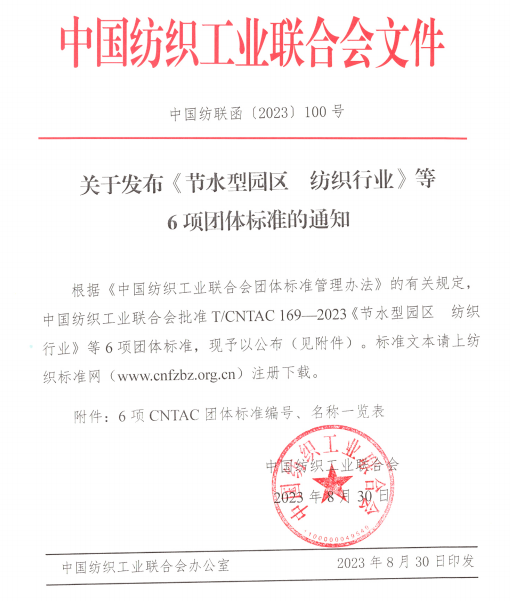 根据《中国纺织工业联合会团体标准管理办法》的有关规定,中国纺织工业联合会于2023年8月30日批准发布T/CNTAC 169—2023《节水型园区 纺织行业》等6项中国纺联团体标准,标准自2023年10月1日起实施(标准清单见下表)。标准文本请上纺织标准网(www.cnfzbz.org.cn)“CNTAC标准工作平台”注册后免费下载。