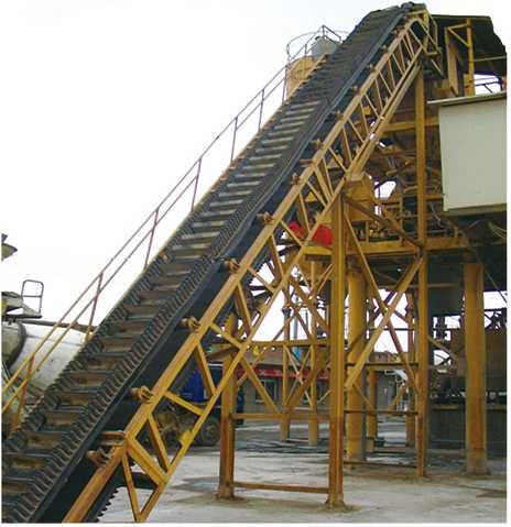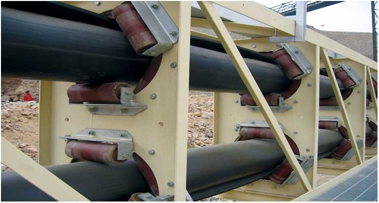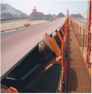 管状带式机是由呈六边形布置的托辗把胶带裏成边缘互相搭接成圆管状来输送物料的一 种新型带式输送机。Tubular belt conveyor is made up of section six-sided layout edge roller tape,which wrapped into overlapping each other into a circular tubular conveying material to a new type of belt conveyor.The bottom of the mobile belt conveyor is equipped with a universal wheel, which can be moved freely according to the stacking position of materials, and its height can be adjusted within the prescribed range.波状挡边带式输送机 Corrugated Ribbed Belt Conveyor