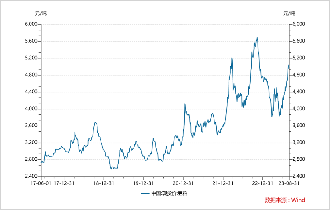 以豆粕为例,现货价格从2019年的不到3000元/吨一路涨至2022年最高价超5600元/吨。今年一季度短暂下跌到4000元/吨以下,二季度又拉了起来,重新站上5000元/吨。