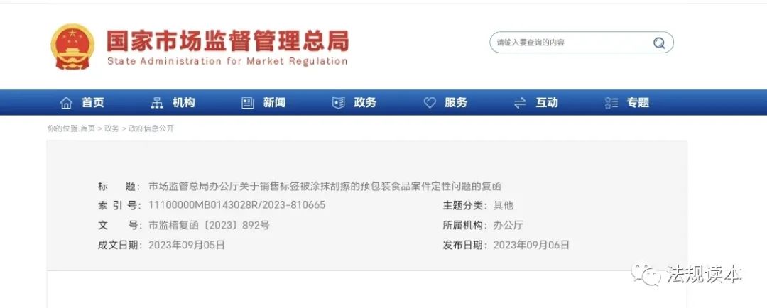 市场监管总局办公厅关于销售标签被涂抹刮擦的预包装食品案件定性问题的复函