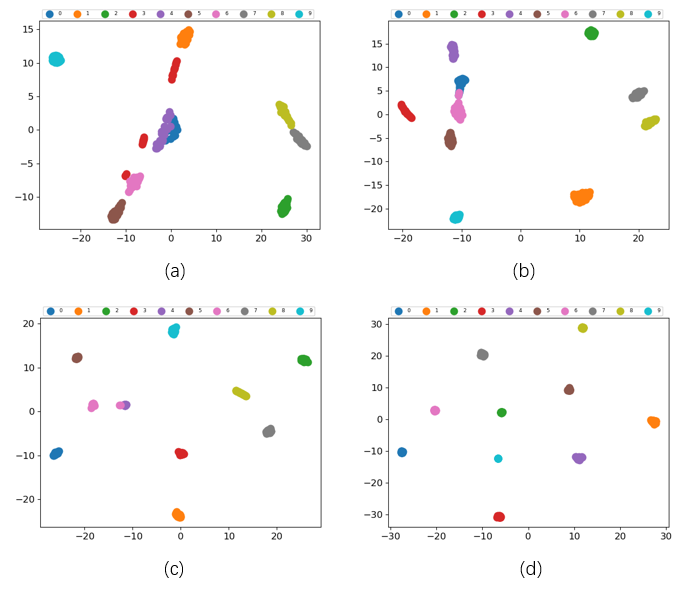 图4 不同模型使用数据A中t-SNE可视化结果。(a) LeNet-5, (b) ResNet18, (c) VGG16, (d) CCN。