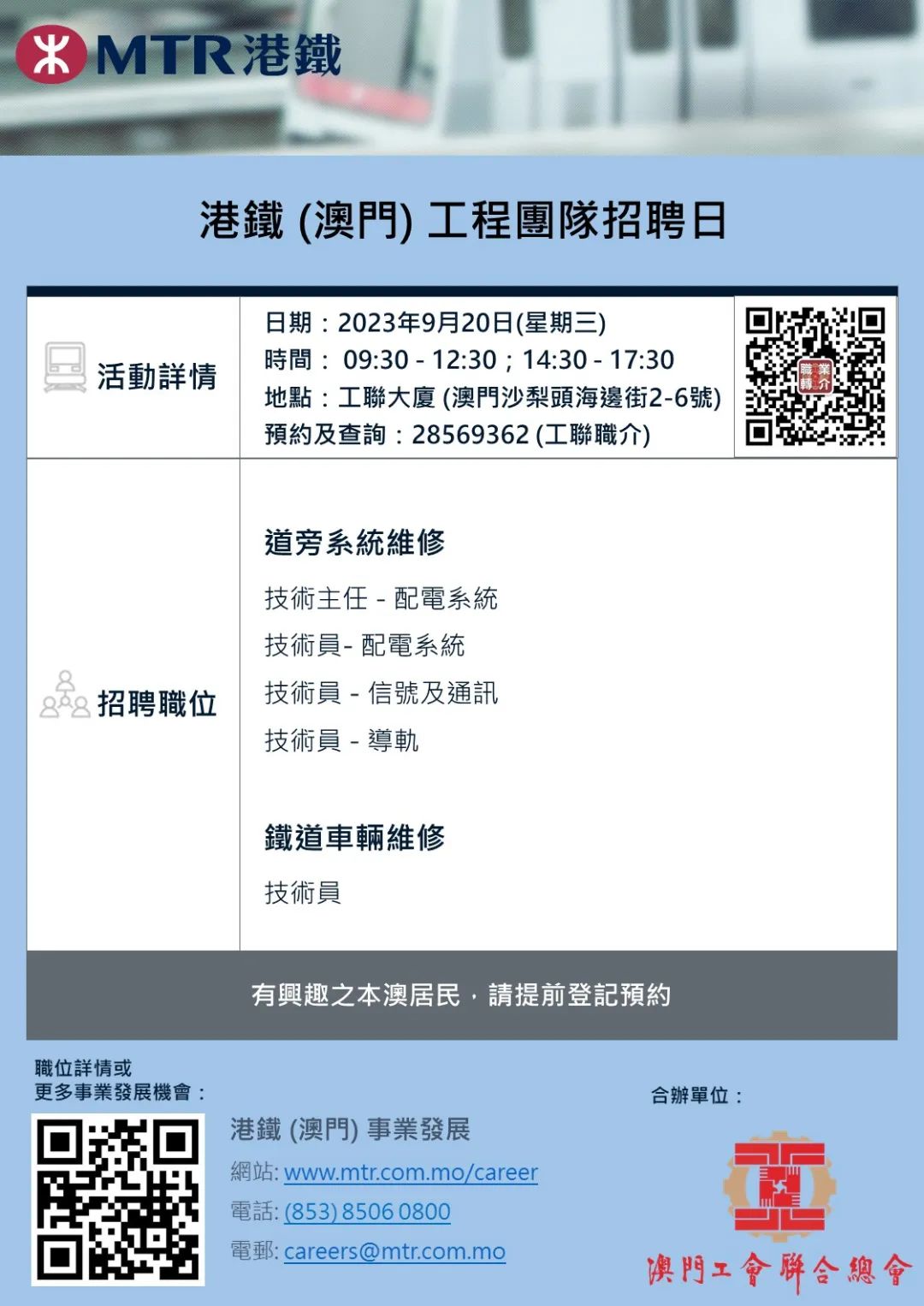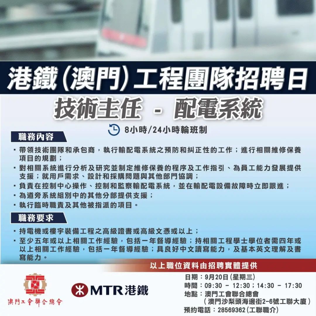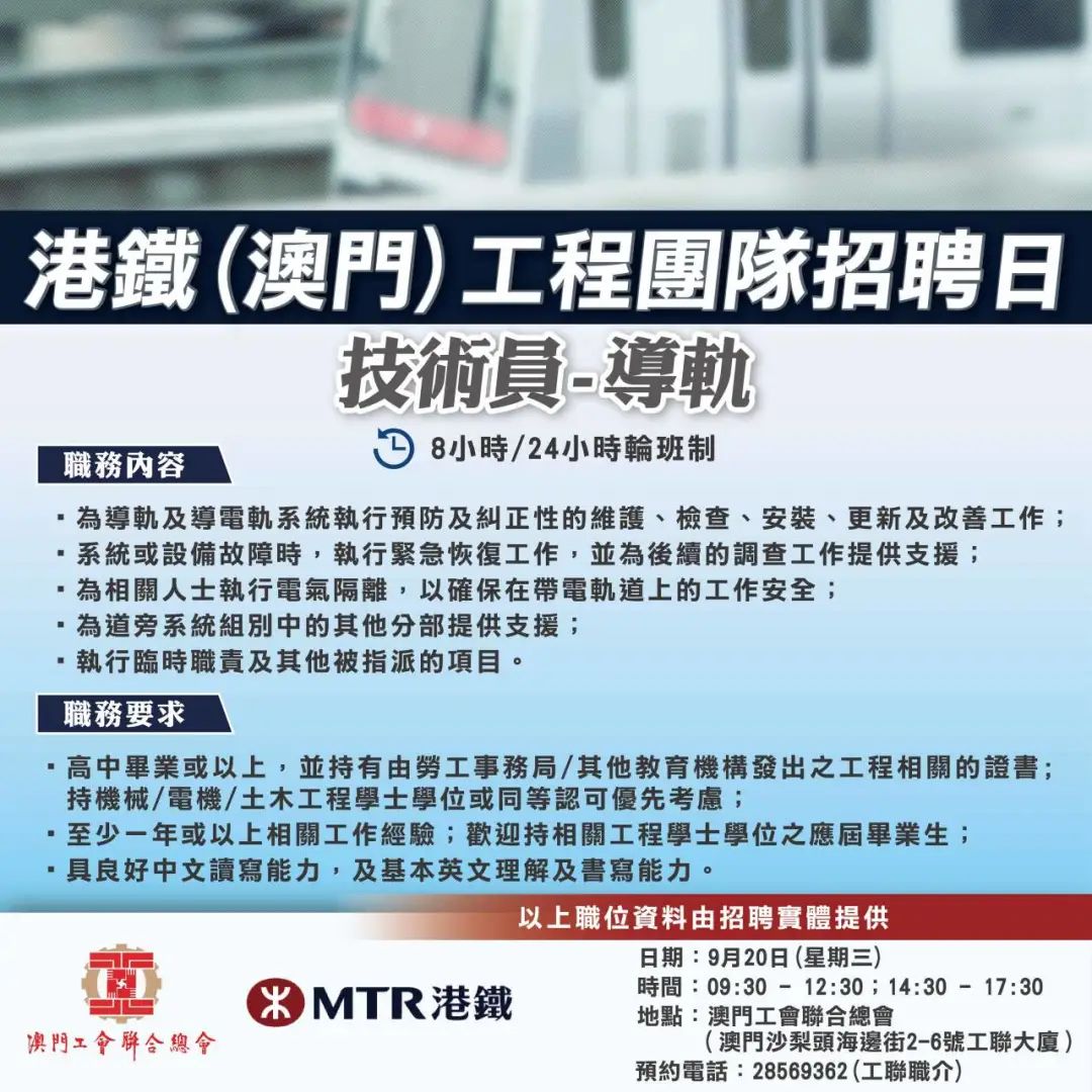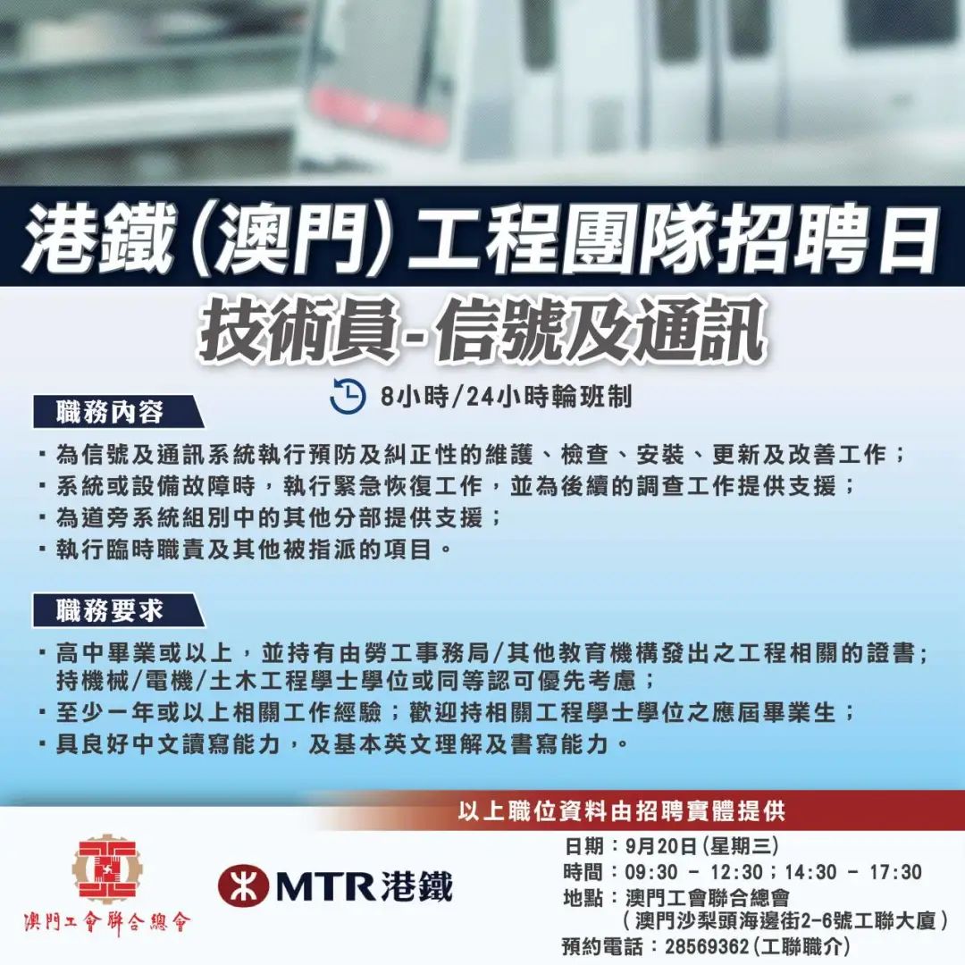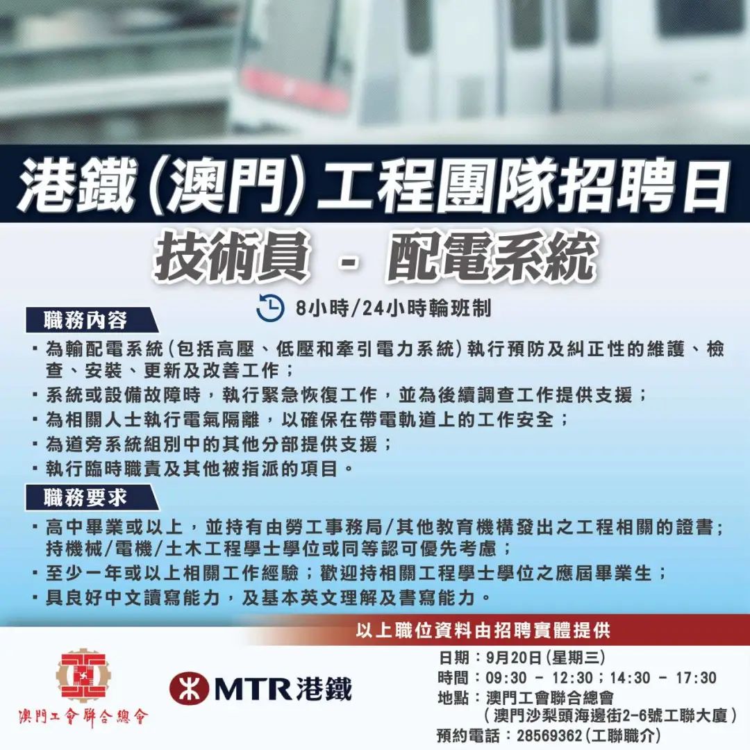 9月20日工聯總會與港鐵(澳門)舉辦招聘日,招聘日將提供技術主任-配電系統、技術員-配電系統、信號及通訊、導軌、鐵道車輛維修職缺。有意加入工程團隊人士,歡迎致電預約見工及查詢。