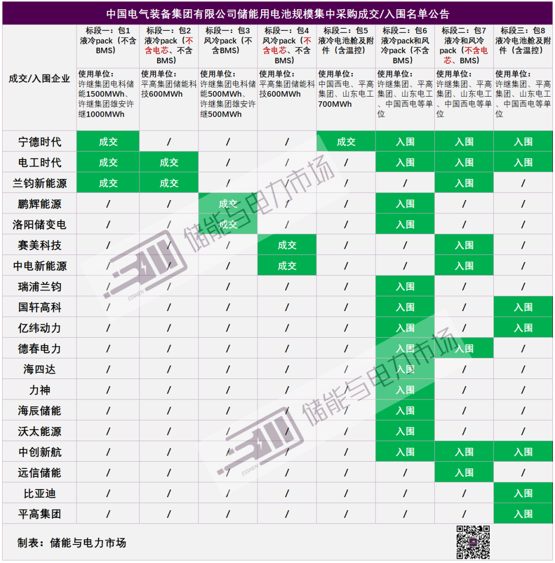 储能与电力市场获悉,9月6日,中国电气装备集团有限公司储能用电池规模集中采购成交/入围名单公布。本次集采分三个标段共8个标包,电池Pack(含电芯)总采购量超3.5GWh。19家企业成交/入围,其中,