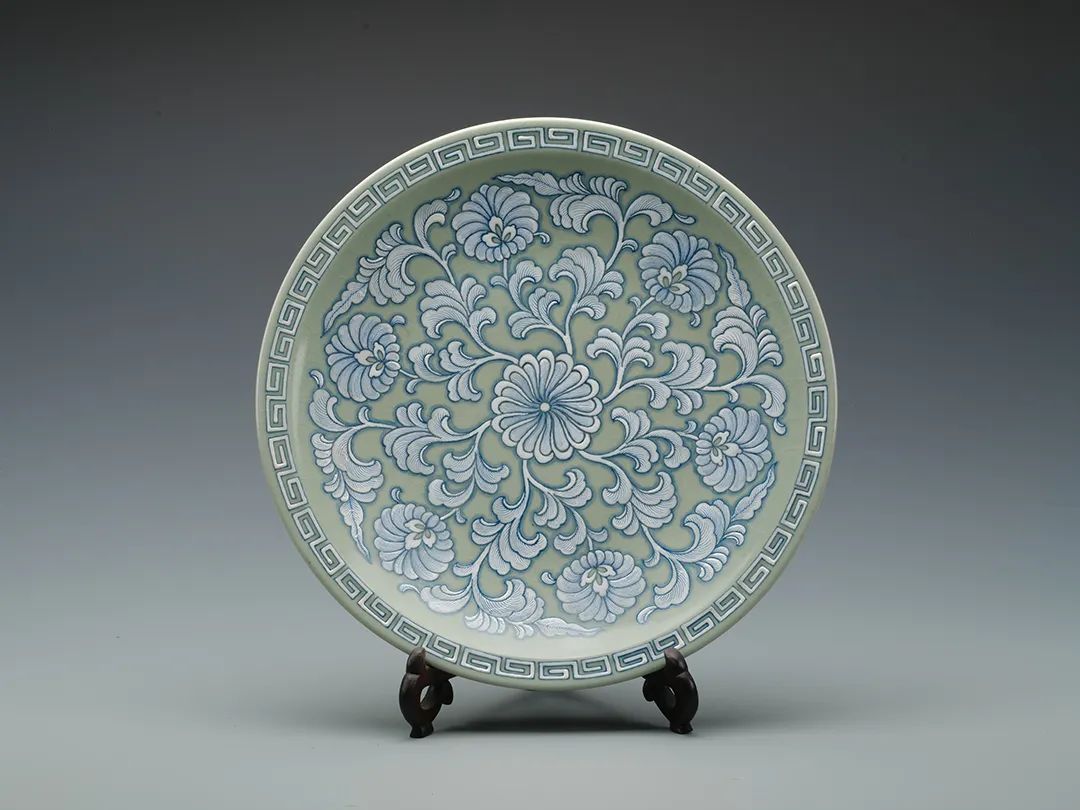 现代越窑青瓷粉彩盘“缠枝牡丹” 嵇锡贵