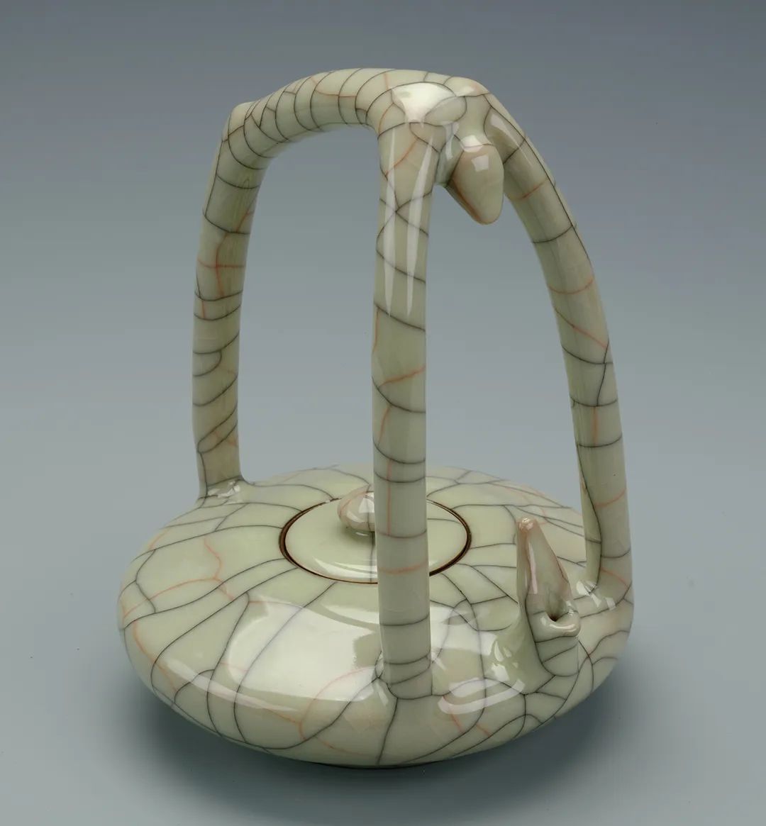 现代龙泉青瓷金猴戏龟提梁壶 张绍斌