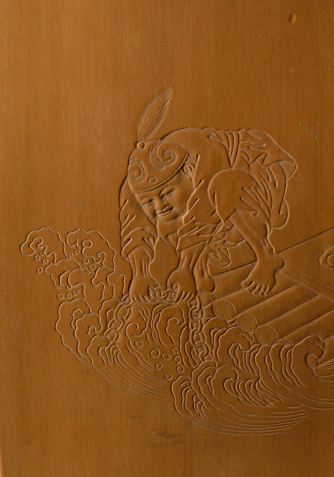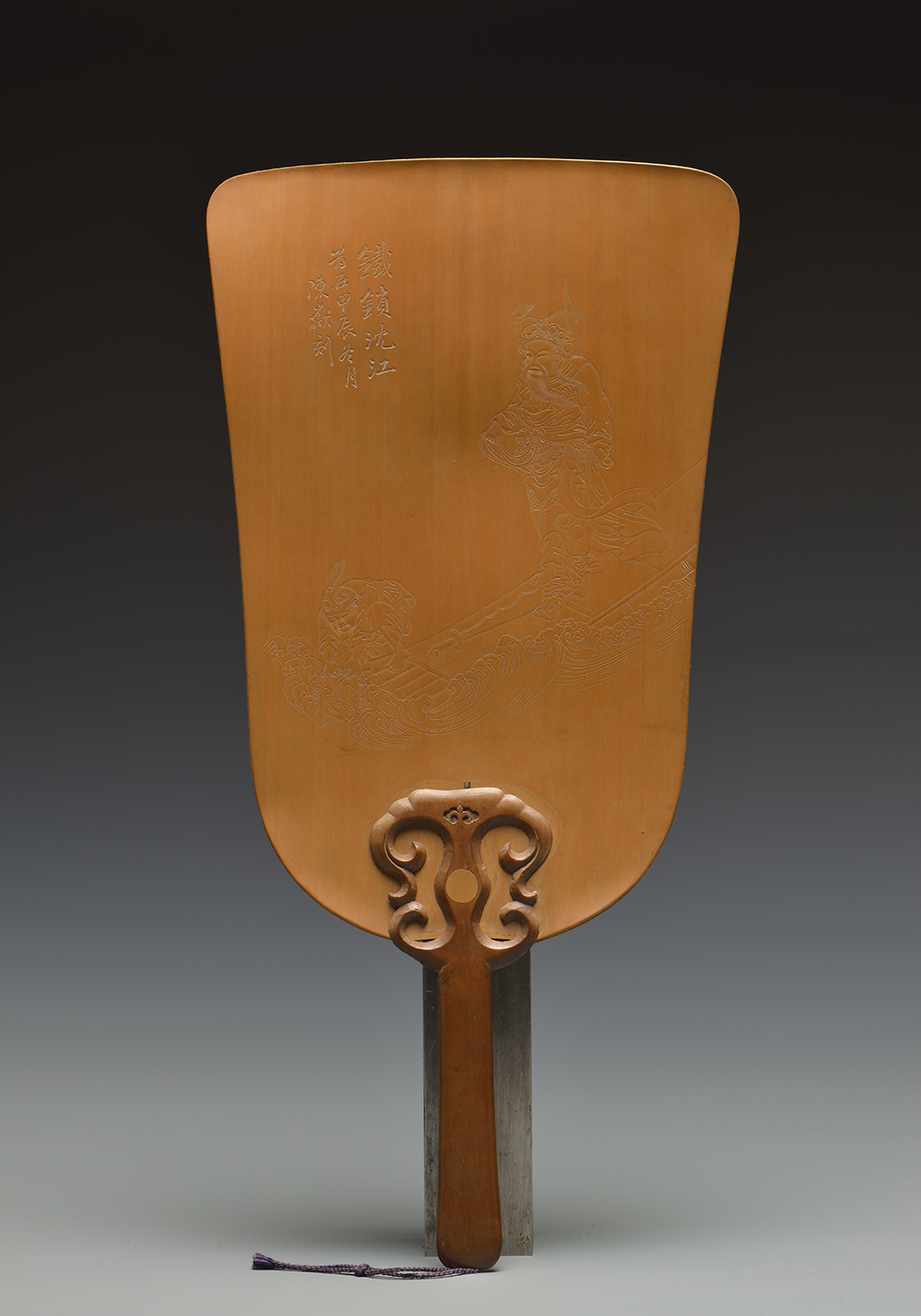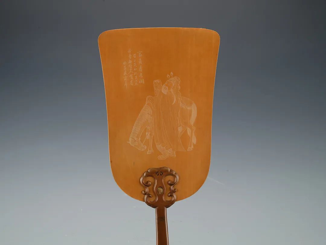 清翻簧竹雕“铁锁沉江”纹掌扇 陈岳