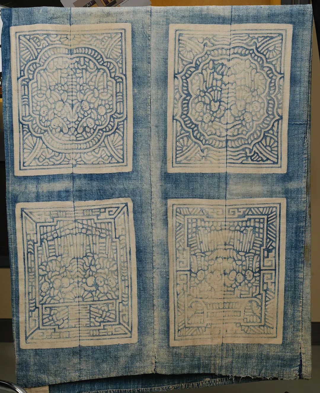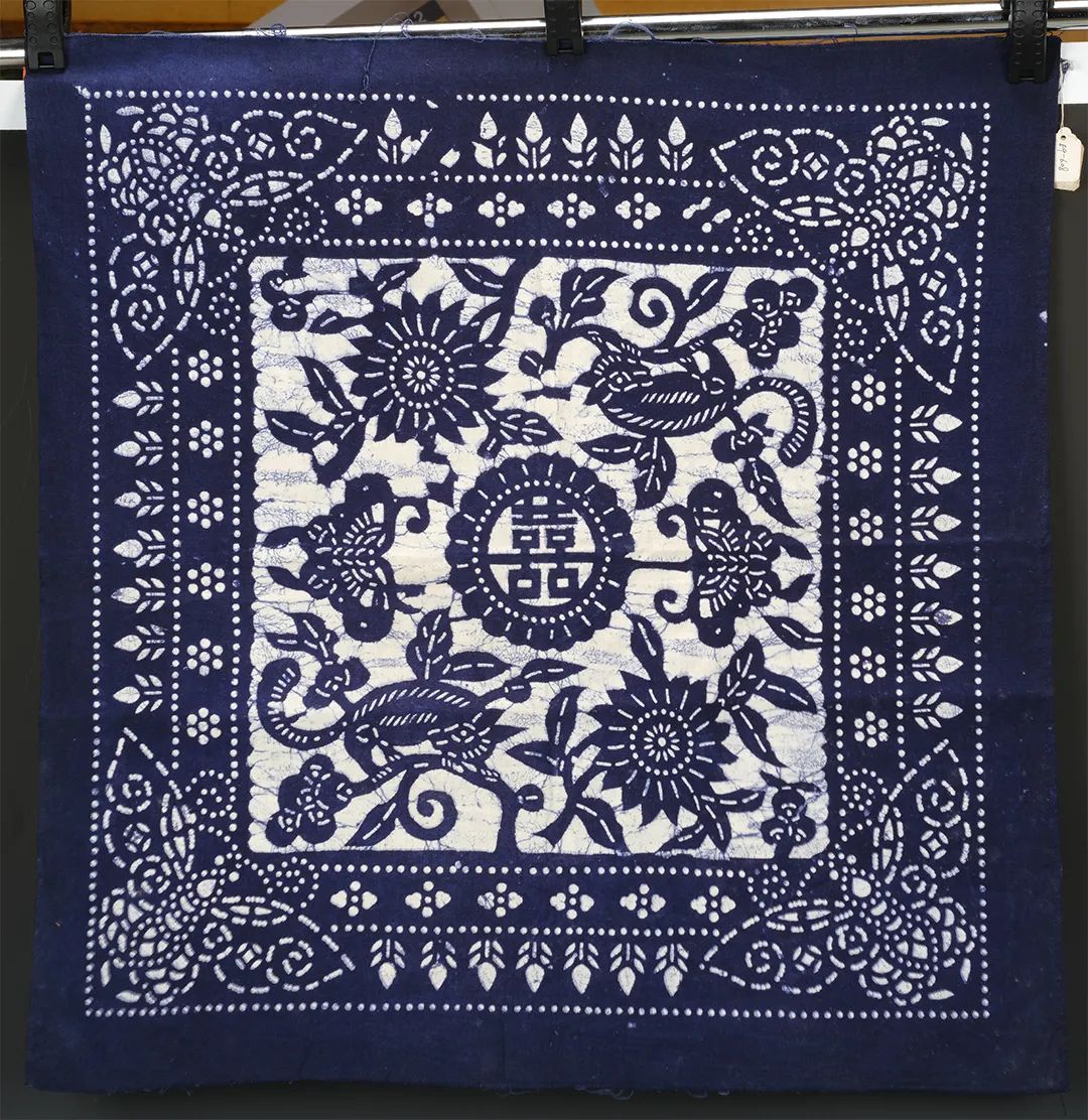 夹缬,其利用雕板紧夹待染织物,使染液进入雕板的“明渠暗沟”,浸染出预定效果。历经一千多年风雨沧桑的夹缬工艺品,其外观已与典籍记载大为不同:曾经的鲜艳斑斓变成了蓝底白纹;样式局限于用作被面;纹样从汉唐宋明的花草虫鸟鱼兽变成浙南地区晚清戏台上耳熟能详的生旦净丑!某种意义上,中国古老的夹缬的神貌已深深植入于当代独具地方特色的“浙南夹缬”。