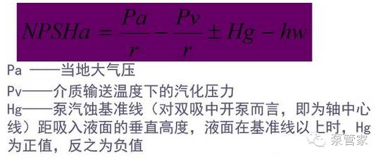 泵装置汽蚀余量NPSHa的值是由装置确定的,它与当地大气压Pa,输送介质的汽化压力Pv,泵汽蚀基准线离吸入液面的几何高度Hg,吸入管路的阻力损失hw有关,具体的计算公式为: