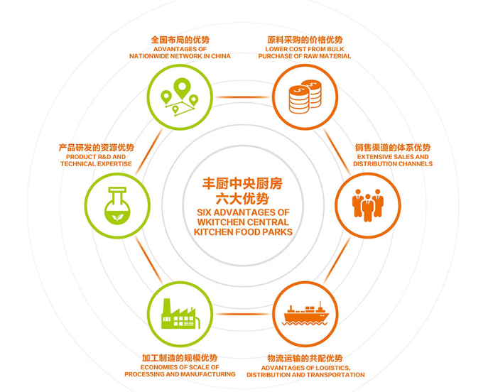 益海嘉里上游端联合全球原料供应商,实现各中央厨房园区供应链优化、规模化管理,在中央厨房园区内进行预加工、预生产出中式面点、中西式烘焙制品、炸制食品、蒸制产品、汤羹甜品、冷链鲜食、菜肴调理类产品、净菜、肉类预制产品等,进行统一产出调配,构建以粮食类主食为核心的中餐工业化餐饮供应链平台。