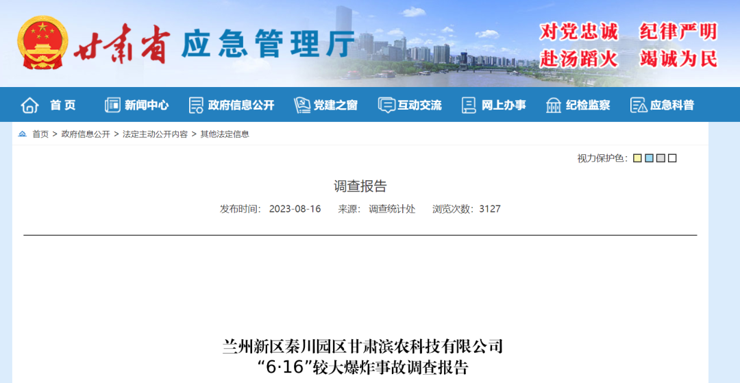 近日,甘肃省应急管理厅公布了《兰州新区秦川园区甘肃滨农科技有限公司“6·16”较大爆炸事故调查报告》。