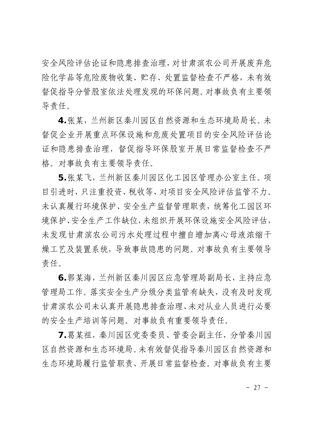 事故调查报告显示,甘肃滨农科技公司总经理、环保治理部主任和生产安全部副主任等8人因对事故负有直接责任,涉嫌刑事犯罪,建议被移送司法机关处理。
