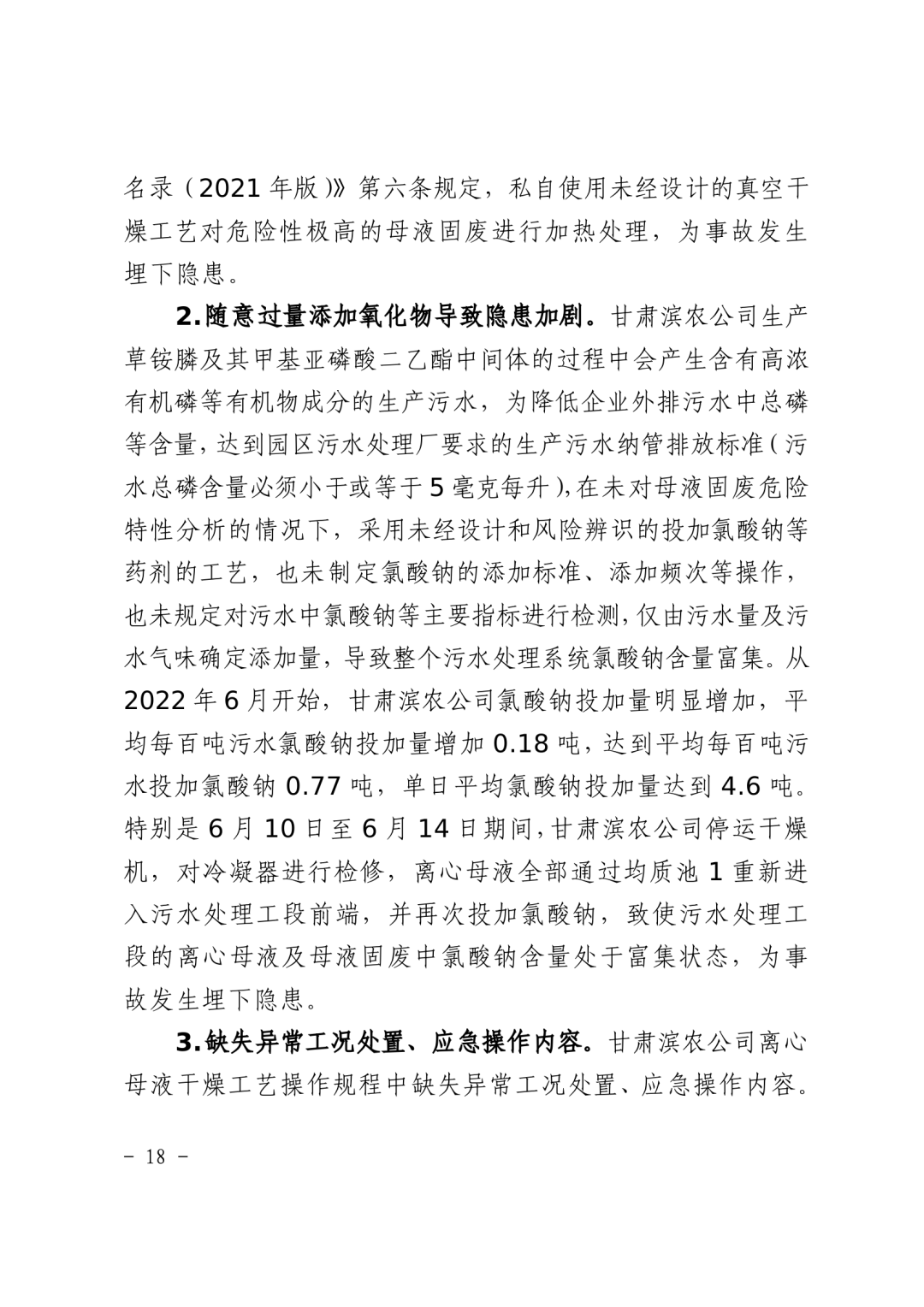 同时,为降低企业外排污水中总磷等含量,以达到园区污水处理厂要求排放标准,甘肃滨农科技公司还随意过量添加氯酸钠,这也为事故发生埋下隐患。