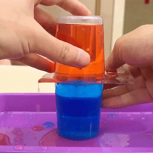 原理:色素不溶于油,但溶于水,泡腾片遇水产生二氧化碳,气泡将染色的水带到油层,再在重力的作用下会落于水。