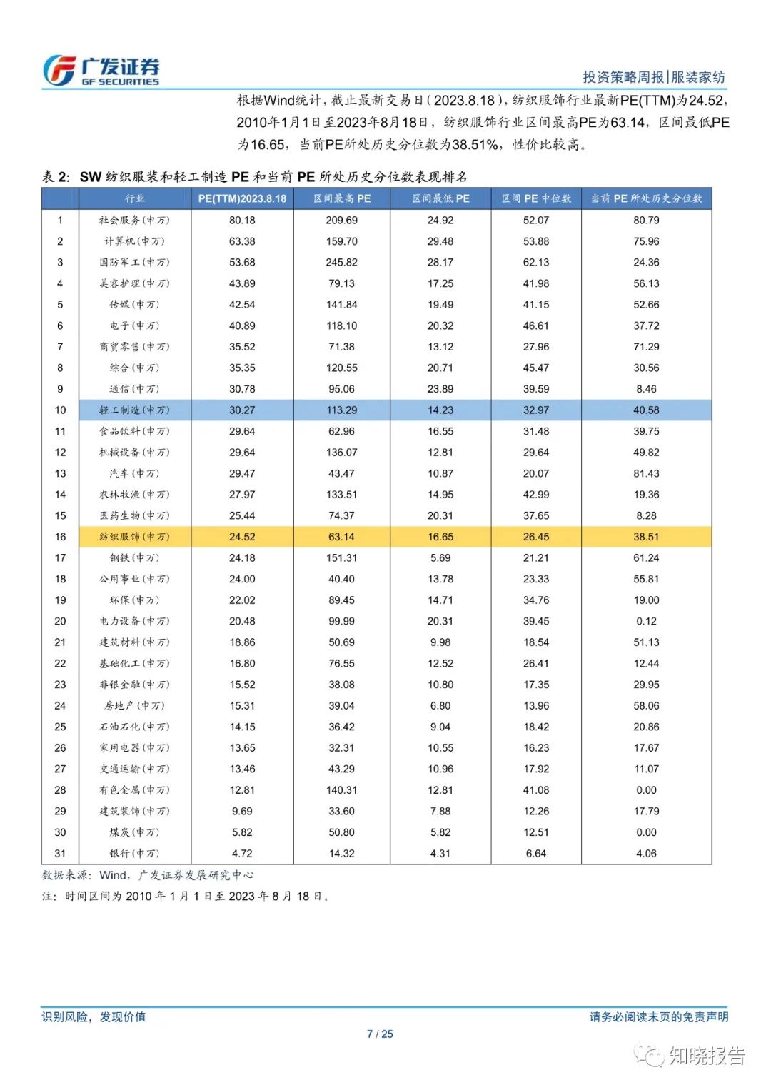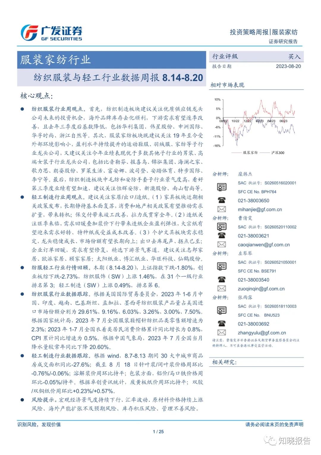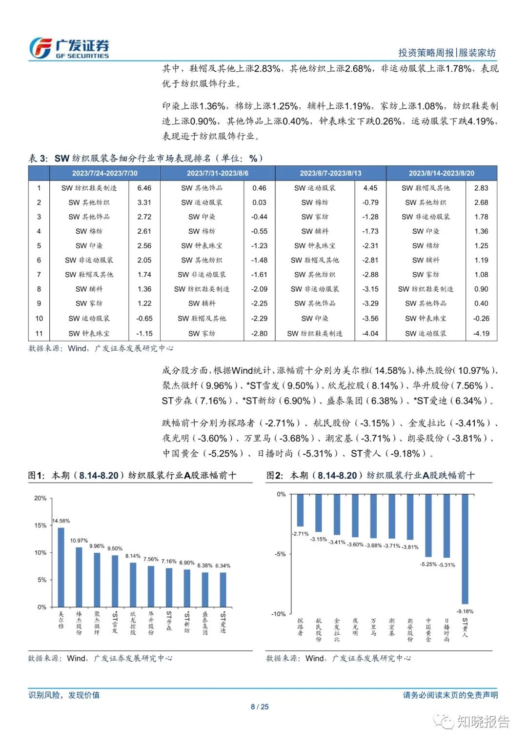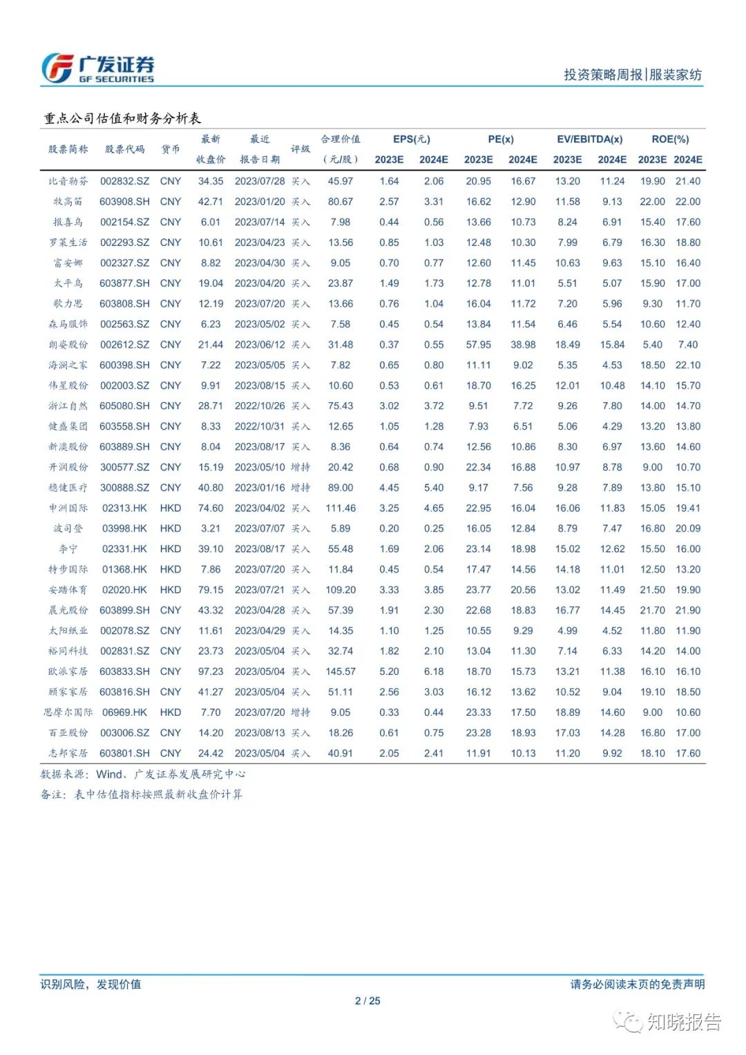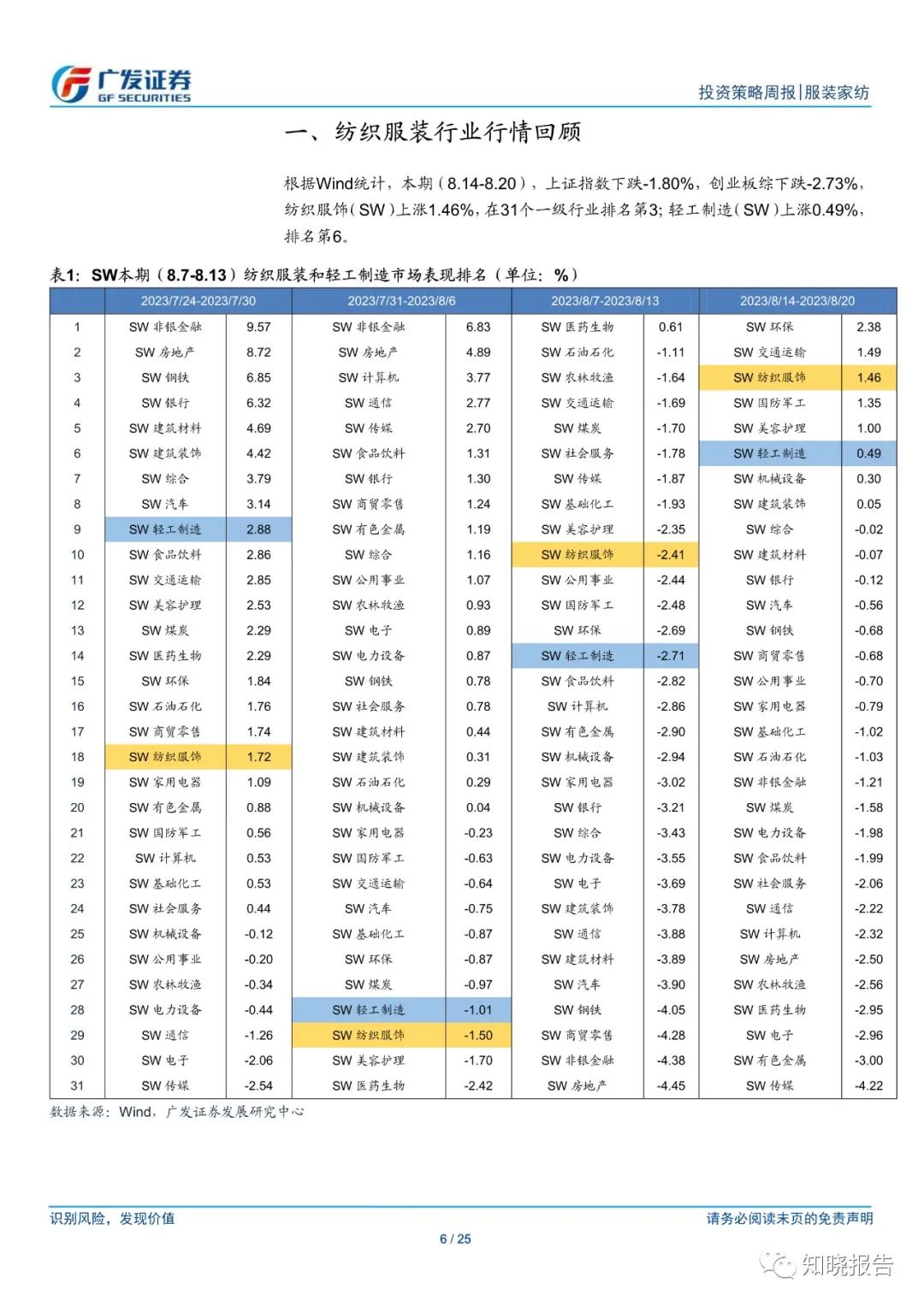 纺织服装行业周观点。首先,纺织制造板块建议关注优质供应链龙头公司未来的投资机会,海外品牌库存去化顺利,下游需求有望逐季改善,且去年三季度后基数降低,包括华利集团、伟星股份、申洲国际、华孚时尚、浙江自然等。其次,服装家纺板块既建议关注19年至今受外部环境影响小,盈利水平持续提升的运动鞋服、羽绒服、家纺等子行业龙头公司,又建议关注今年业绩表现优于多数其他子行业的男装、高端女装子行业龙头公司,包括比音勒芬、报喜鸟、锦泓集团、海澜之家、歌力思、朗姿股份、罗莱生活、富安娜、波司登、安踏体育、特步国际、李宁等。最后,纺织制造板块中毛纺和安防手套子行业景气度高,看好第三季度业绩有望加速,建议关注恒辉安防、新澳股份、南山智尚等。