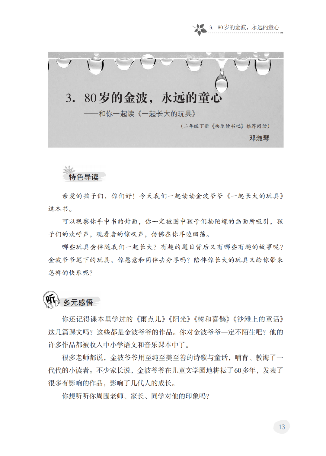 2023年9月8日晚8:00—8:30,山西教育出版社《上读书课啦·春蕾卷》作者之一邓淑琴老师将在《童声朗朗》节目中为大家荐读《一起长大的玩具》,欢迎收听直播!