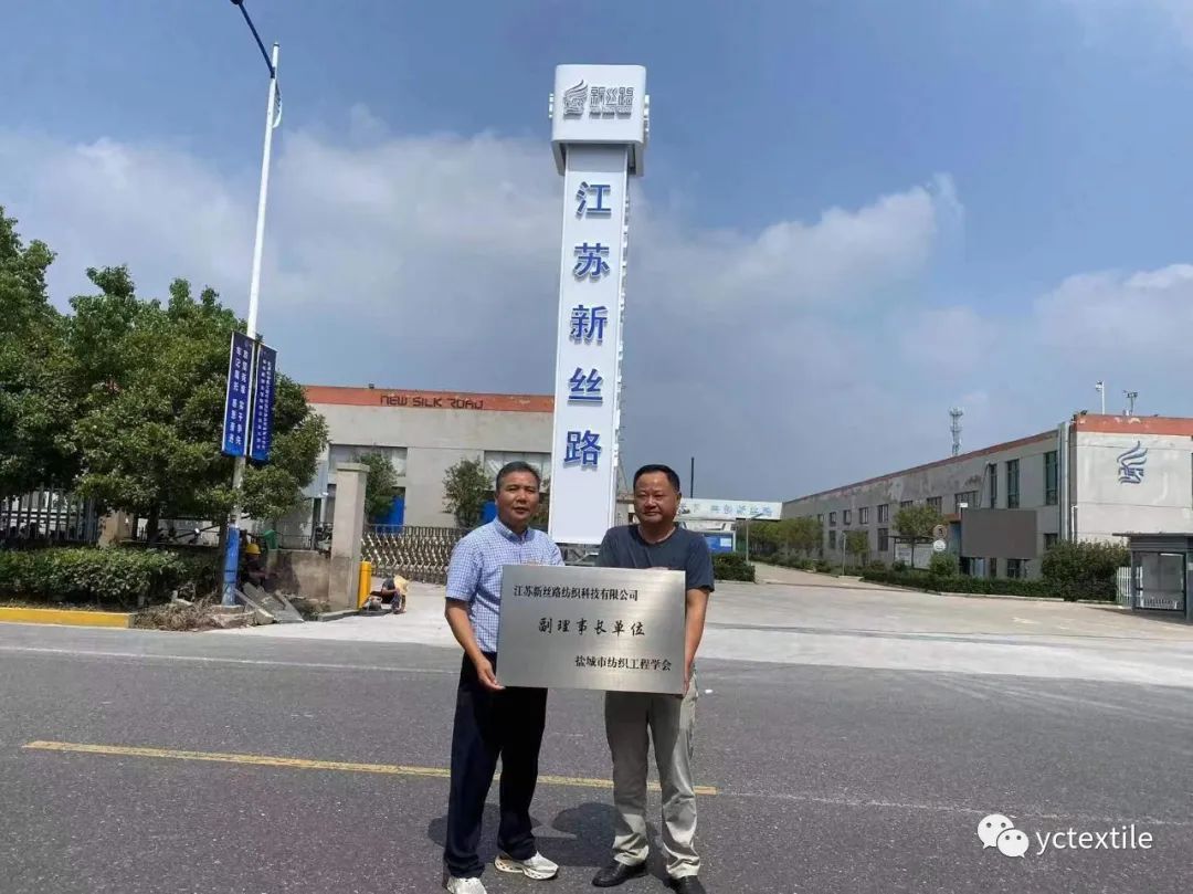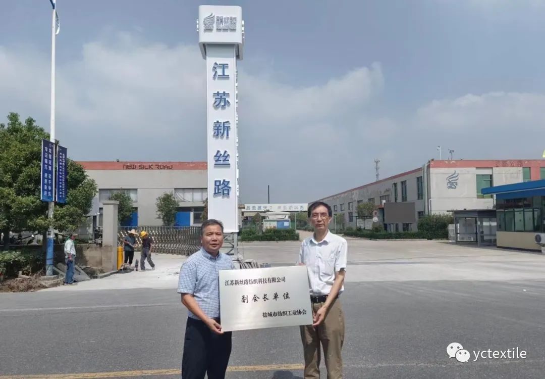 2023年9月7日,江苏新丝路纺织科技有限公司获选“盐城市纺织工业协会副会长单位”、“盐城市纺织工程学会副理事长单位”,盐城市纺织工业协会副会长兼秘书长张岱华、盐城市纺织工程学会副理事长程建亚一行来到江苏新丝路纺织科技公司举行授牌仪式。