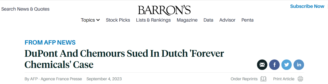 据法新社报道,9月4日,荷兰律师对美国化工巨头杜邦及子公司科慕提起集体诉讼,指控其在鹿特丹南部的一家工厂造成了数十年所谓的“永久化学物质”污染。