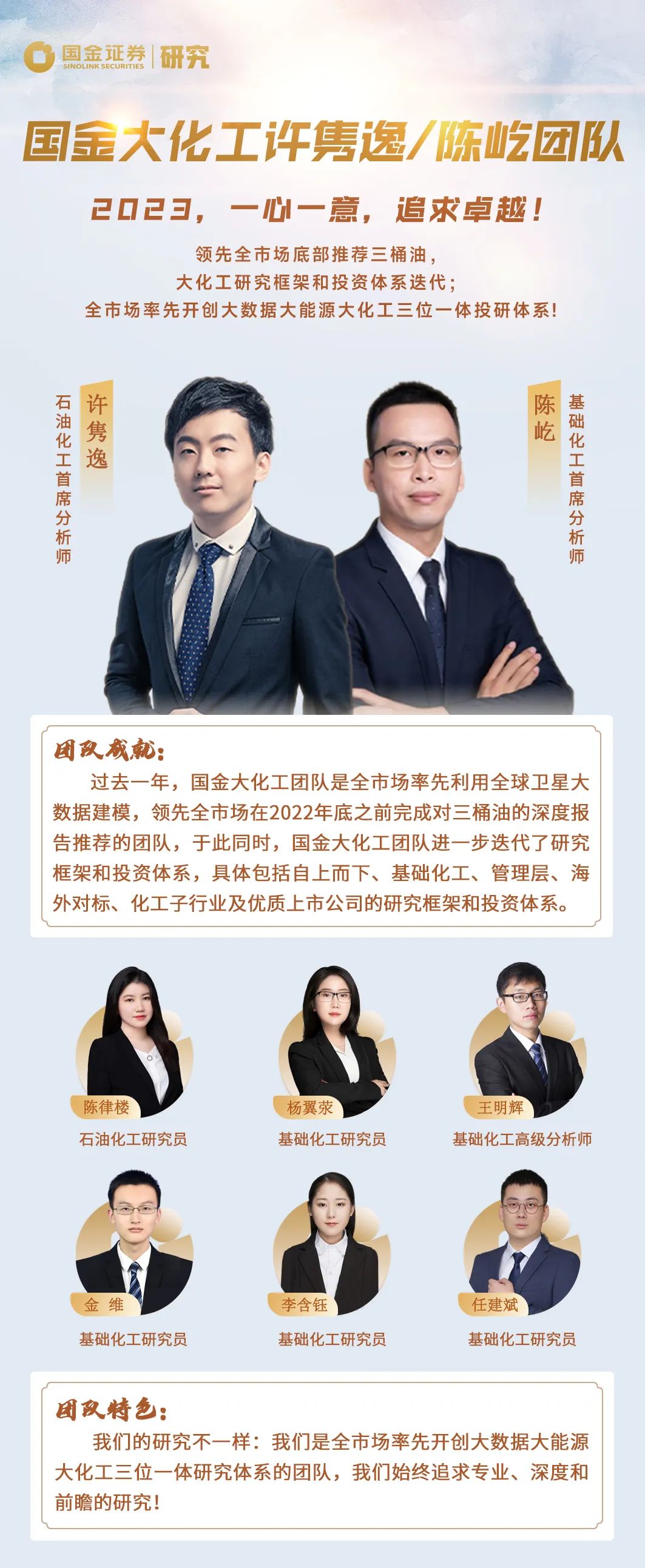 过去一年,国金大化工团队是全市场率先利用全球卫星大数据建模,领先全市场在2022年底之前完成对三桶油的深度报告推荐的团队,于此同时,国金大化工团队进一步迭代了研究框架和投资体系,具体包括自上而下、基础化工、管理层、海外对标、化工子行业及优质上市公司的研究框架和投资体系。