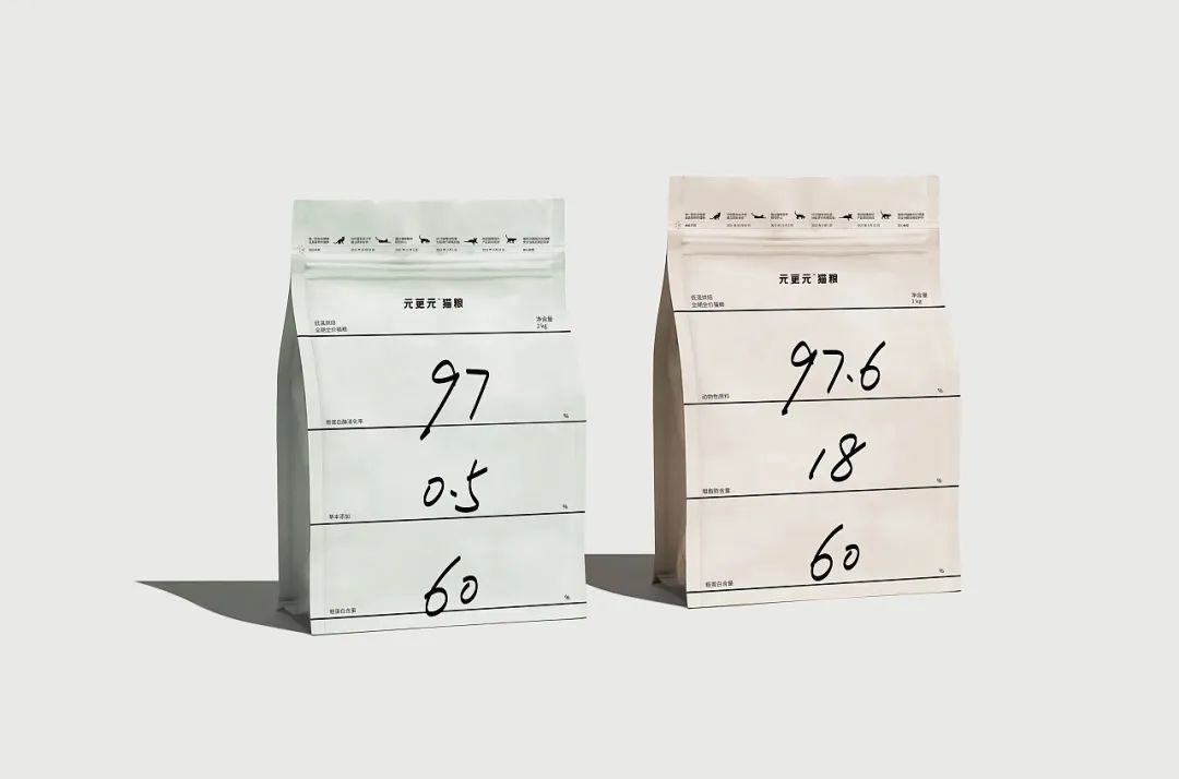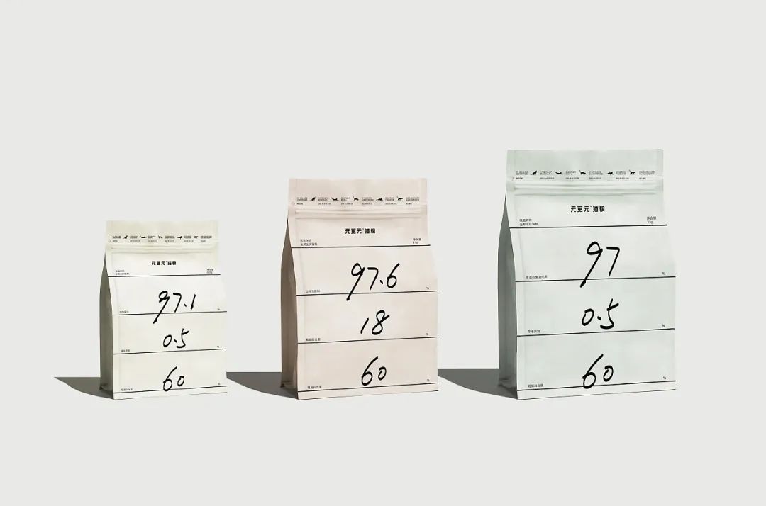 有别于常见的宠物粮包装,元更元采用最简单直接的传达方式,以模拟实验室数据表单的形式,将关键数据手写呈现在不同的应用媒介上,如在包装上手写呈现营养成分表上的核心数据,在水杯上手写呈现猫咪日常饮水量等。