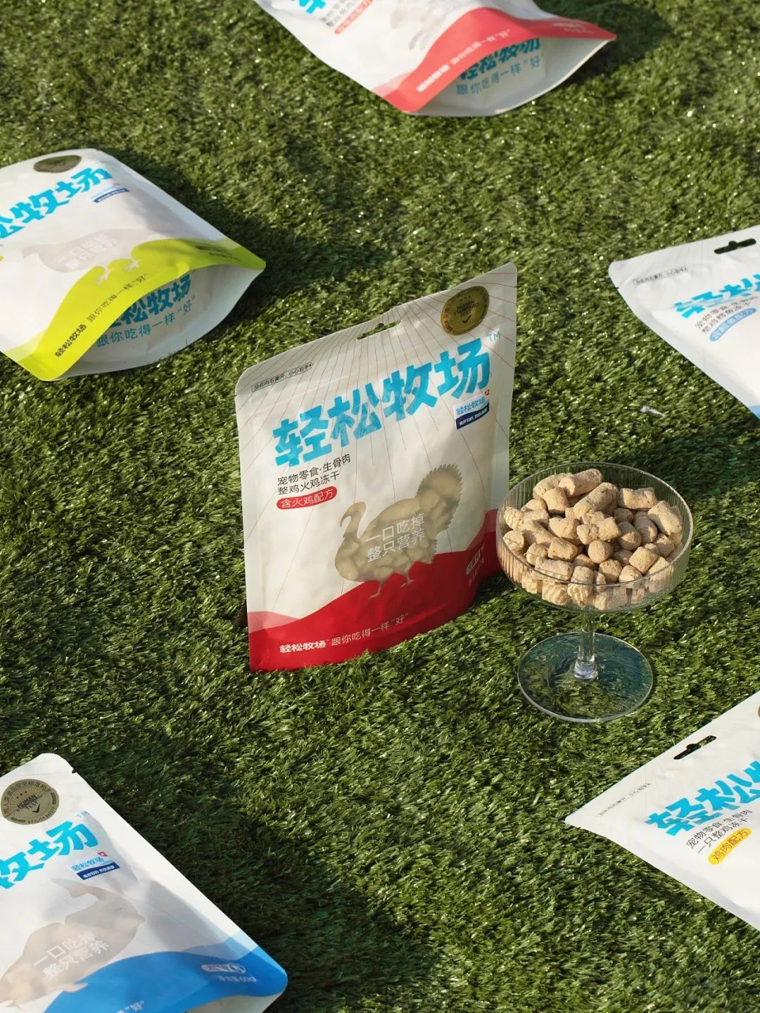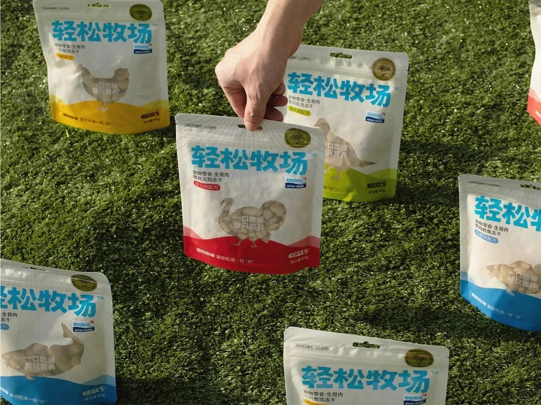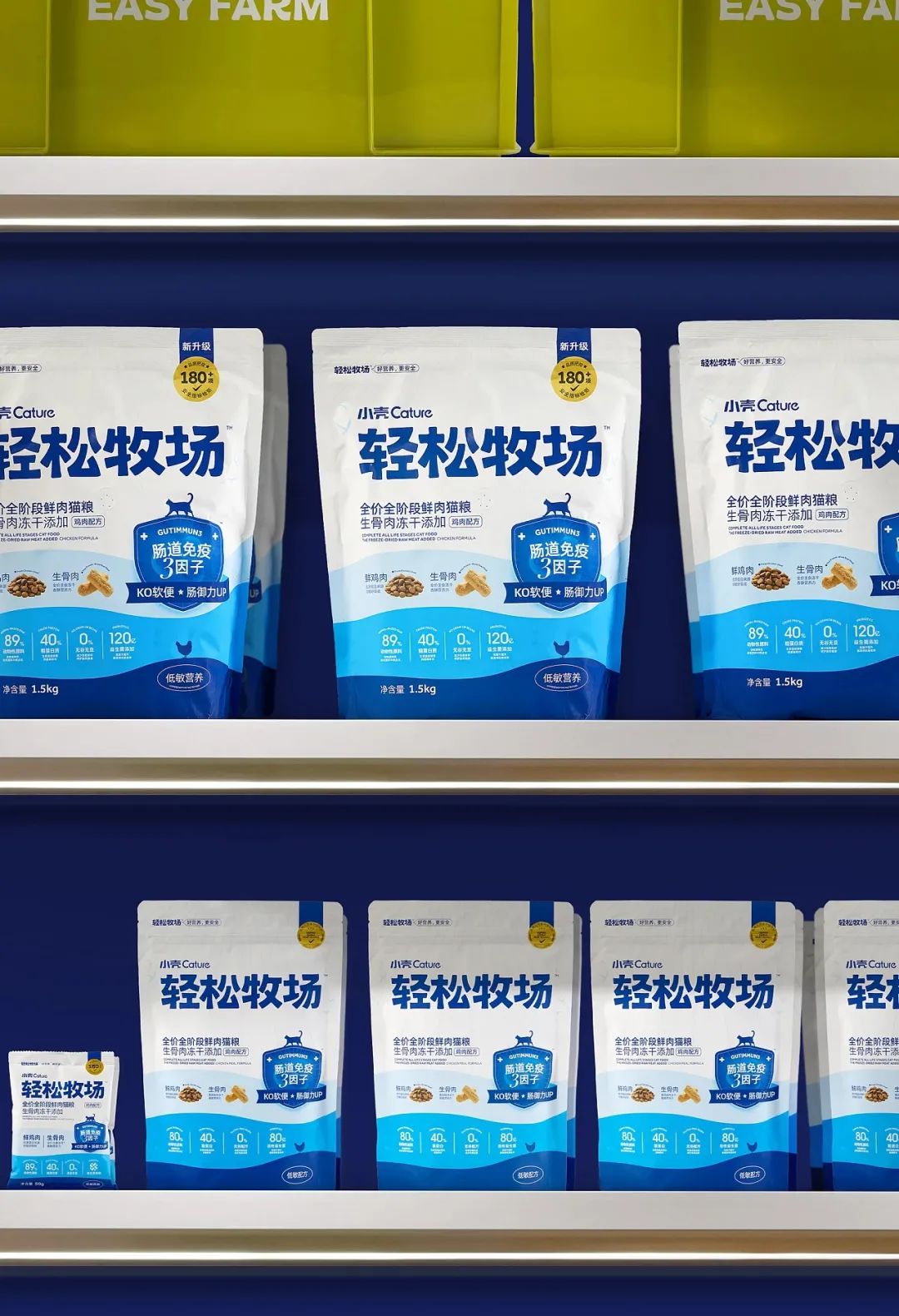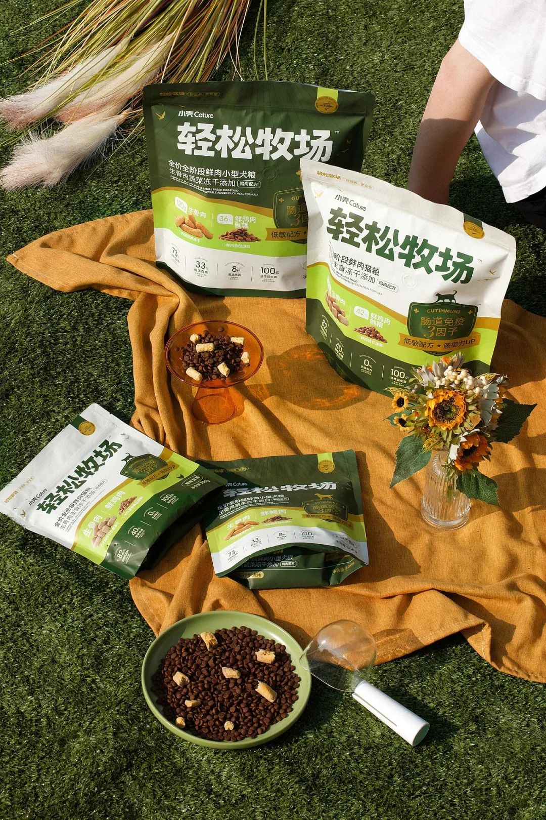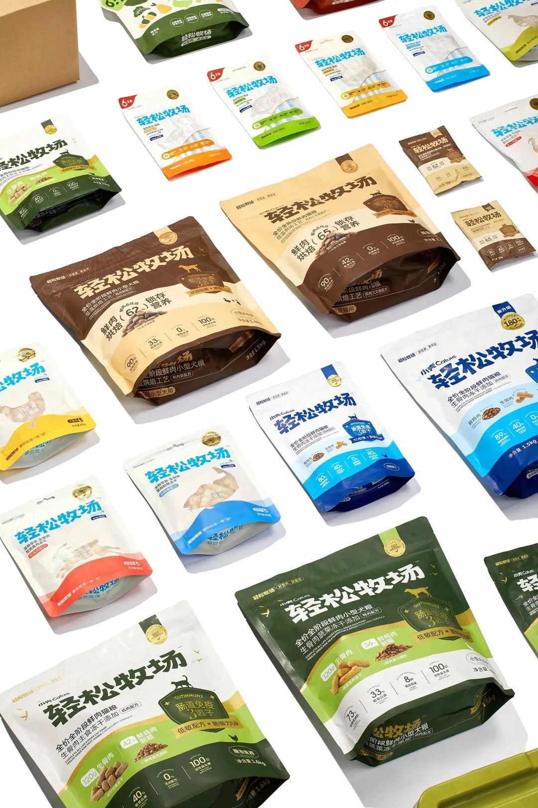 设计上,提取天空蓝、海洋蓝、森林绿以及牧场绿等色彩作为品牌色,并在包装上以层级的形式展现同一色系的不同色调,暗示产品的天然、营养品质;对于宠物而言,也是一种“回归自然”的体验。