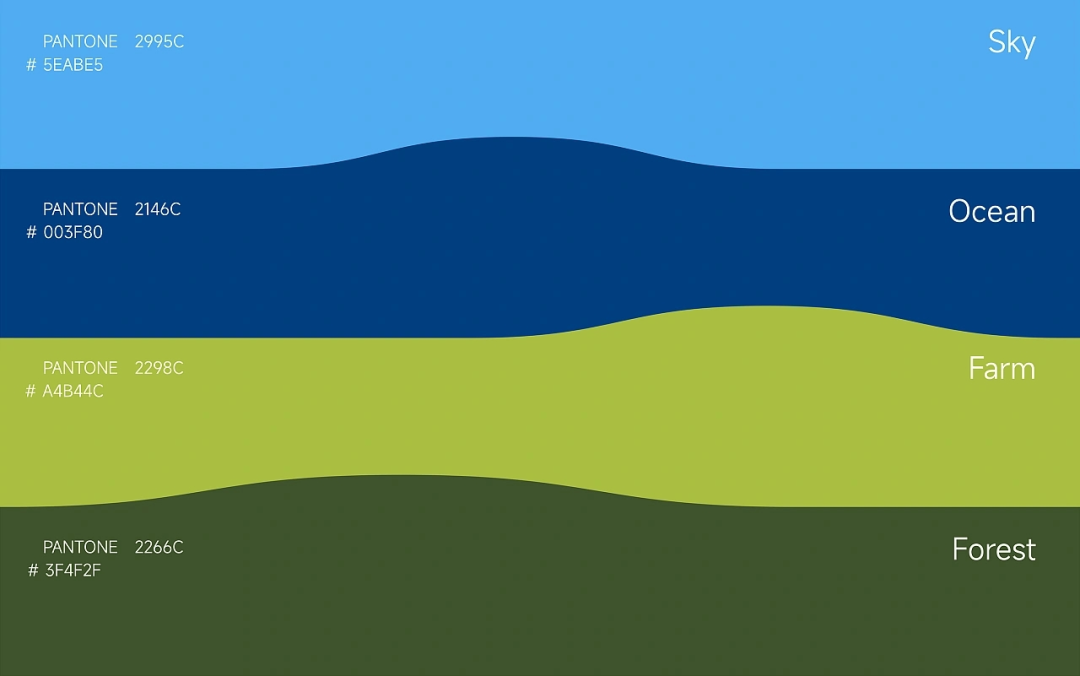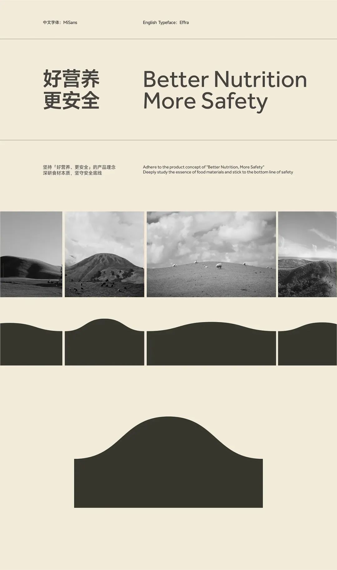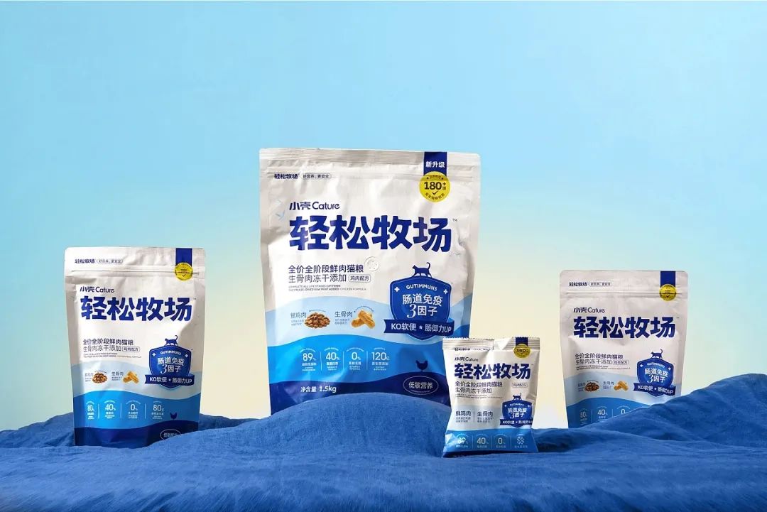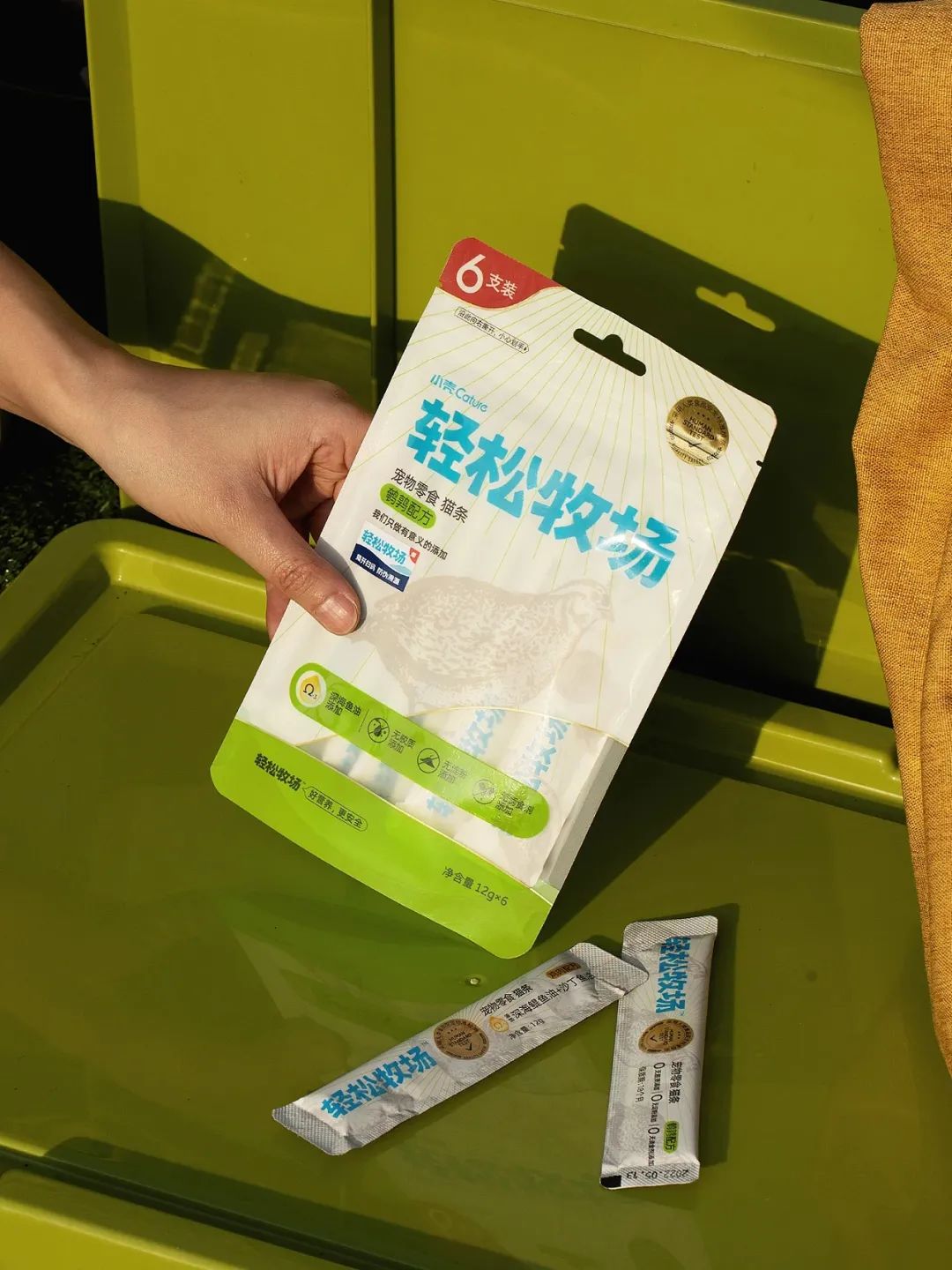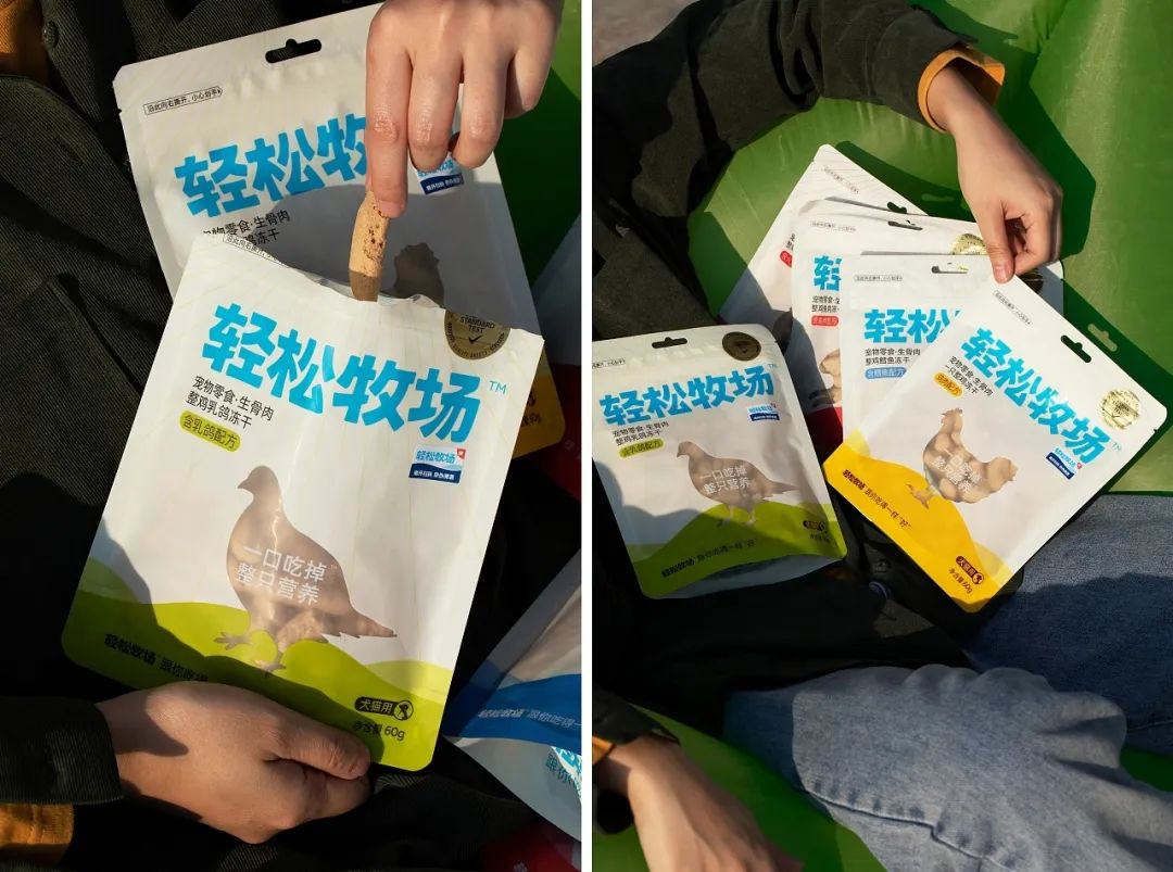 设计上,提取天空蓝、海洋蓝、森林绿以及牧场绿等色彩作为品牌色,并在包装上以层级的形式展现同一色系的不同色调,暗示产品的天然、营养品质;对于宠物而言,也是一种“回归自然”的体验。