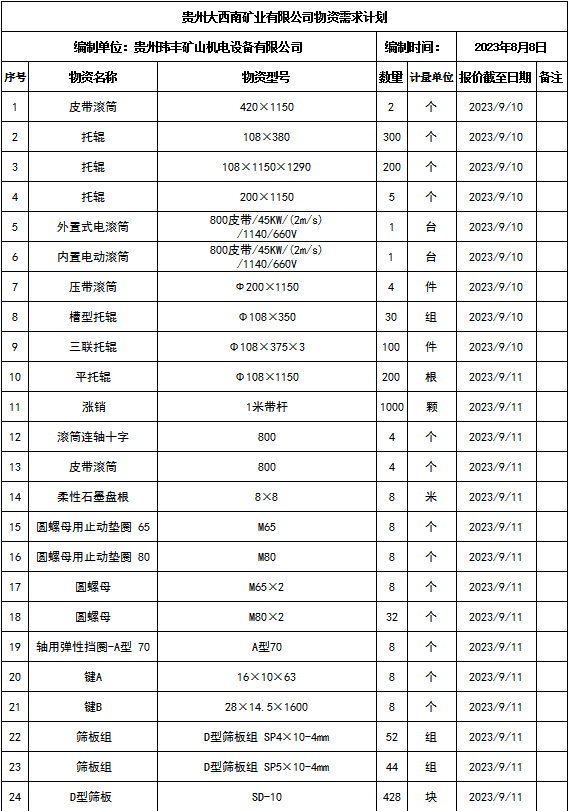 大西南矿业有限公司(以下简称大西南)对“皮带机配件,掘进机配件,刮板机配件,交叉筛配件等”物资2023年9月8日采购项目组织国内公开采购询价,欢迎有相应资质的供应商参与报价,现将相关事宜公告如下: