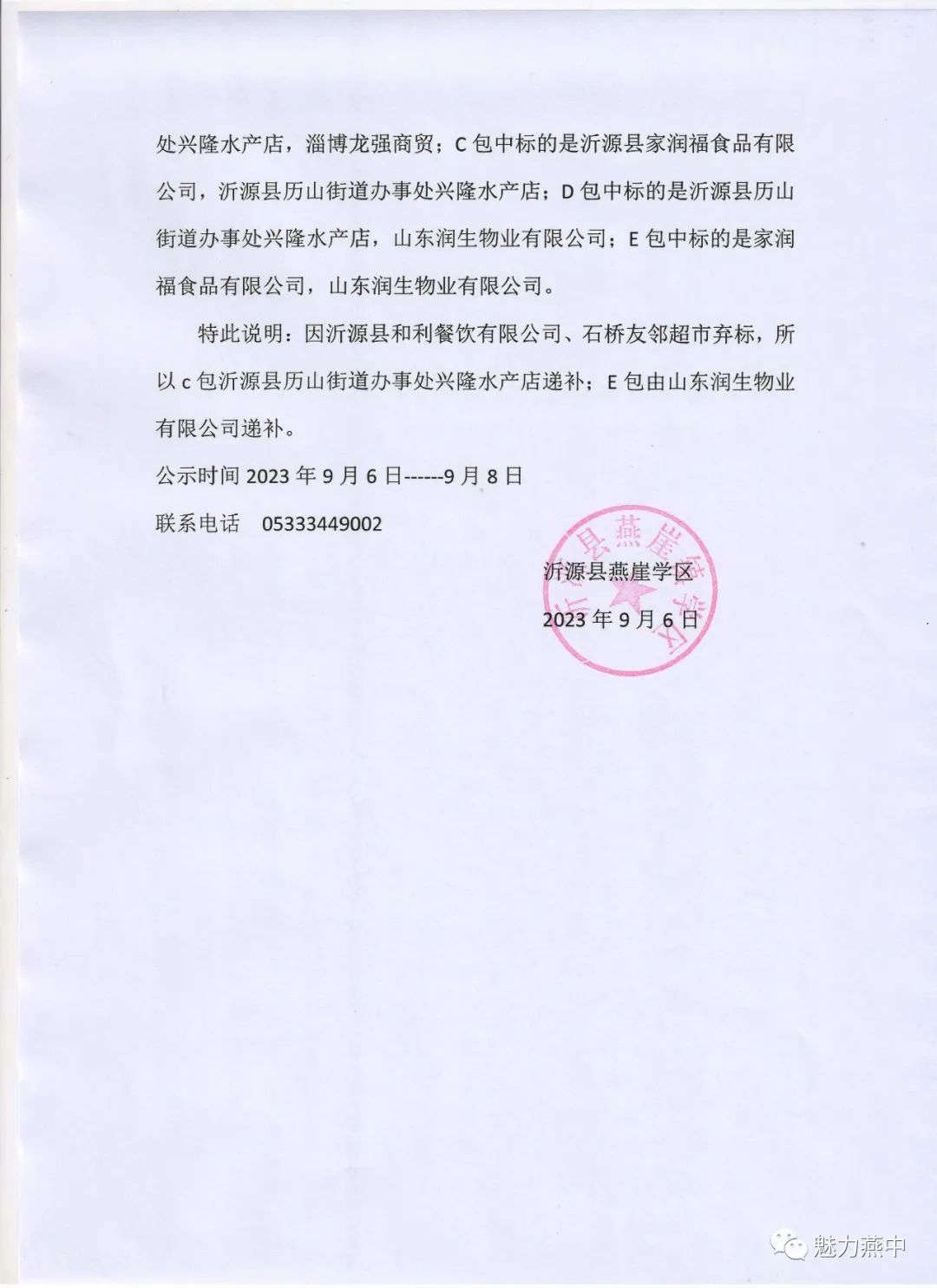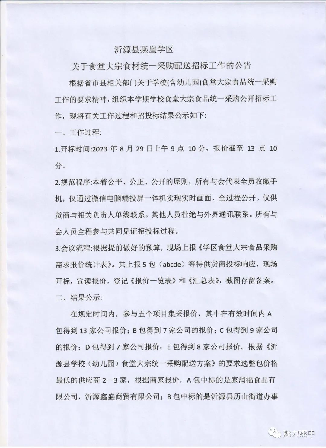 燕崖学区关于食堂大宗食材统一采购配送招标工作公告