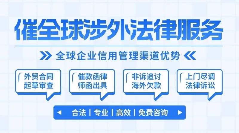 催全球已累计对接了622个国内和国际的信用管理团队,包含各类知名律所、信用管理和催收公司,加入了24个国际信用管理及商账联盟,服务网络遍布216个国家和地区,可以帮您解决多语言涉外合同拟审、催款函/律师函等法律文书出具、出口信用保险保障、通过非诉/诉讼手段追讨货款/解决涉外纠纷等。