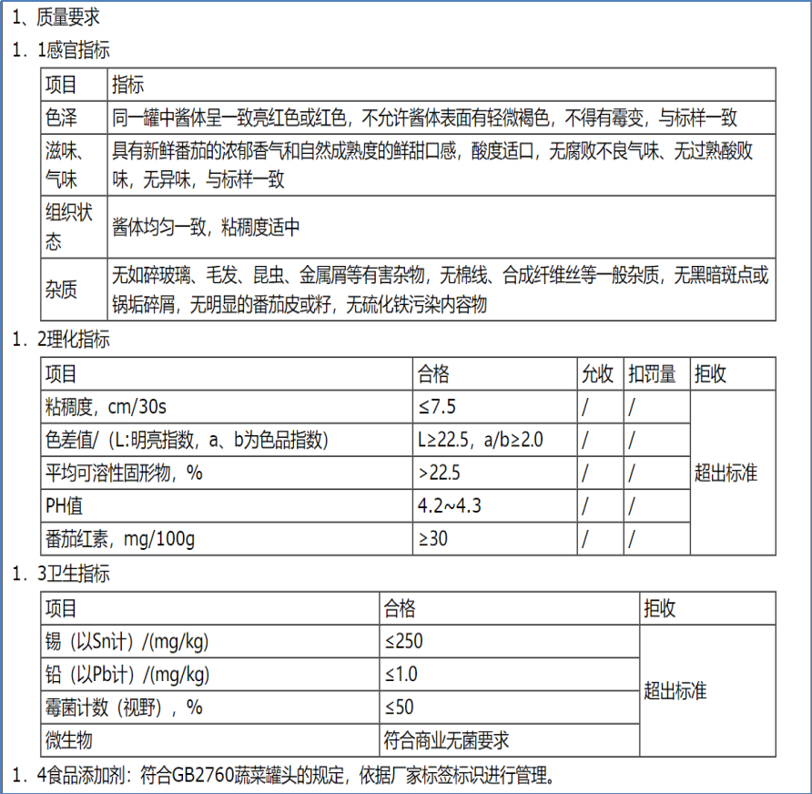 2.标的物及要求番茄酱标准、数量如下: