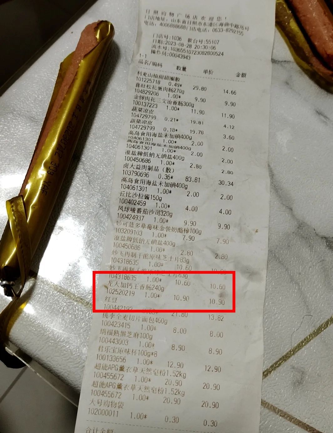 家住老城区的杨先生来信反映,8月28日,他在日照利群买了一些食品,其中有一个本省生产某企业的火腿肠,昨天下午给孩子吃了一个,打开第二根的时候发现肠衣和肠体之间有拉丝现象。
