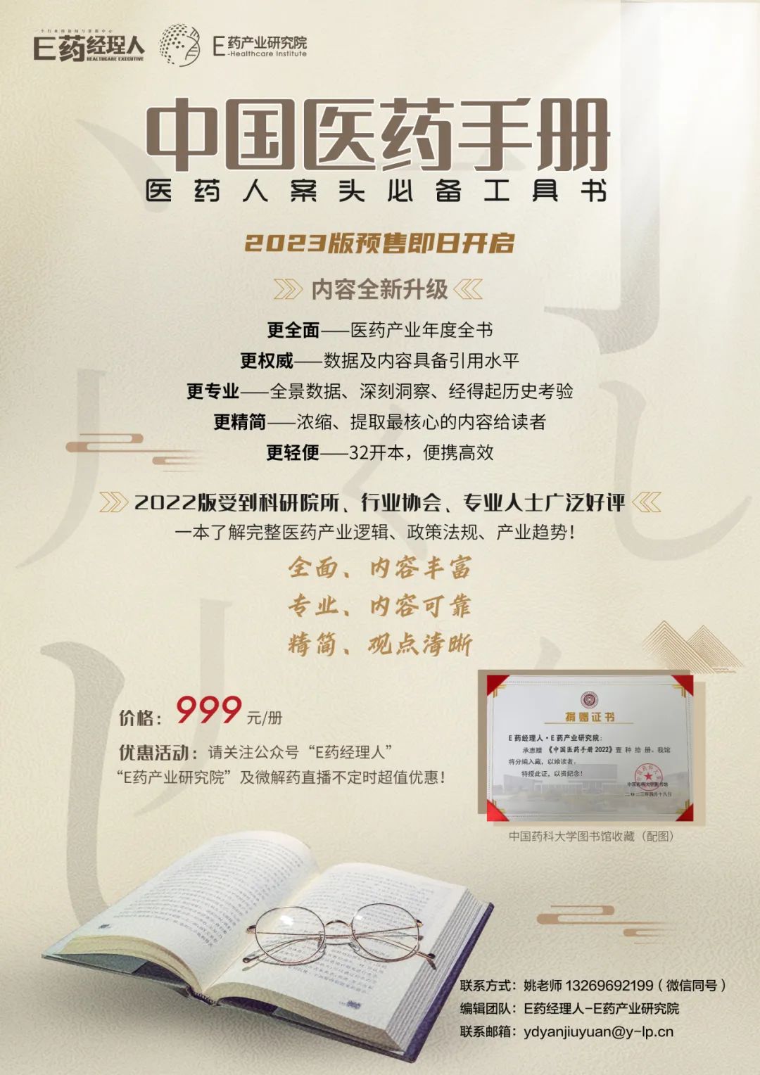 原价999元/册购买《中国医药手册2023》赠送一期价值1000元《E药决策》电子版,并有机会免费收到E药产业研究院发布部分收费报告电子版。