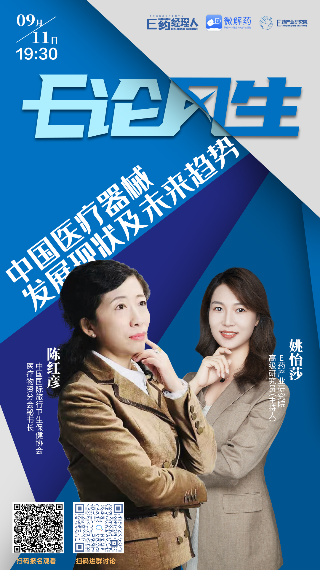 带着以上问题,9月11日19:30《E论风生》,E药产业研究院特别邀请中国国际旅行卫生保健协会医疗物资分会秘书长陈红彦女士分享“中国医疗器械发展现状及未来趋势”的话题直播,欢迎大家参与学习交流!