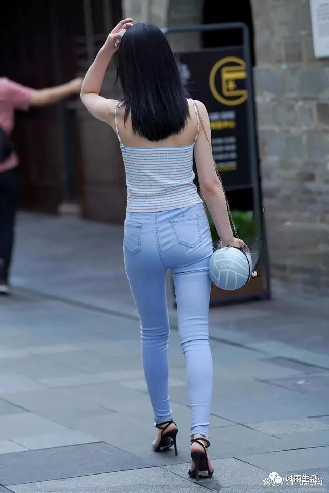 横条吊带背心搭配浅色牛仔裤,挎上个性的篮球形包包,很有个性的搭配方式是一种非常时尚和潮流的穿着方式。