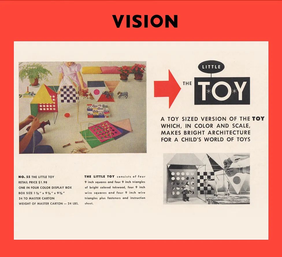 1951 年,“The Toy ”由 Tigrett Enterprises 发行,很快就在孩子们之间风靡起来。第二年,伊姆斯又推出了“小玩具(The Little Toy)”,它更像是一件“迷你版”的建筑模型,由细木棍、彩色的几何形状硬卡纸和一些卡扣组成。