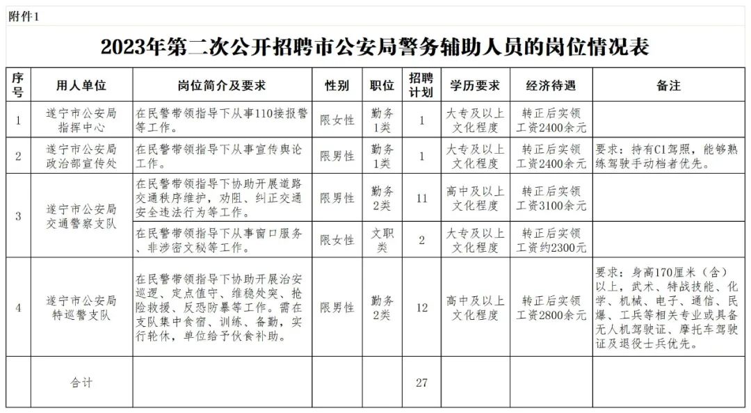 根据相关法律法规,因工作需要,拟面向社会为遂宁市公安局公开招聘27名警务辅助人员,用工性质为劳务派遣。现将有关事项公告如下。