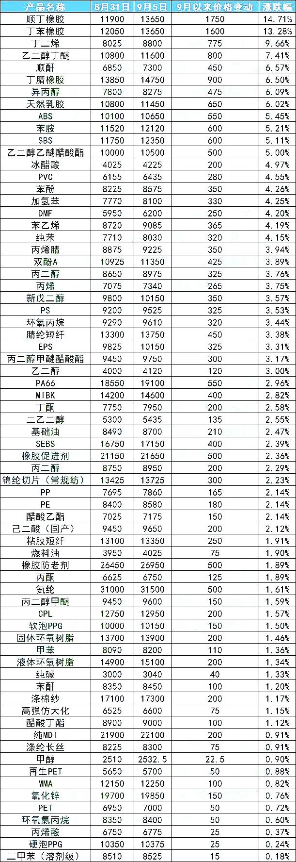 人为控销的手段也在极大程度上推涨了国内化工企业的产品报价,可谓是“买方市场”下的一记反杀。进入9月的几天里,国内60多种原材料价格上涨,吨价最高上涨1750元,涨幅近15%。