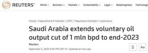 近日,OPEC领导者沙特表示,将自愿减产100万桶/日的措施延长3个月,10月、11月、12月内沙特的日产量将约为900万桶,接下来将每月对自愿减产决定进行审查,以考虑进一步减产或增产。此外,俄罗斯也宣布延长减少石油出口。