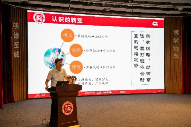 首先邵老师代表各位导师,欢迎2023级研究生新生们的到来。新生入学教育的内容主要分为三个部分。第一个部分是关于认识的转变,该部分又可分为模式、目标、评价和技能四个方面。在模式方面,邵老师提醒同学们要认识到学习模式的转变,要学会在研究过程中将所学知识进行串联;在目标方面,邵老师强调研究生阶段要自成体系,要学会在课程学习中构建一个完整的专业框架;在评价方面,邵老师提醒同学研究生阶段不仅看重课程成绩,而且看重科研成果;在技能方面,邵老师建议同学们要学习并强化文献检索、建模仿真、设计开发等方面的技能,以便更好地应对后续科研生活中的挑战。