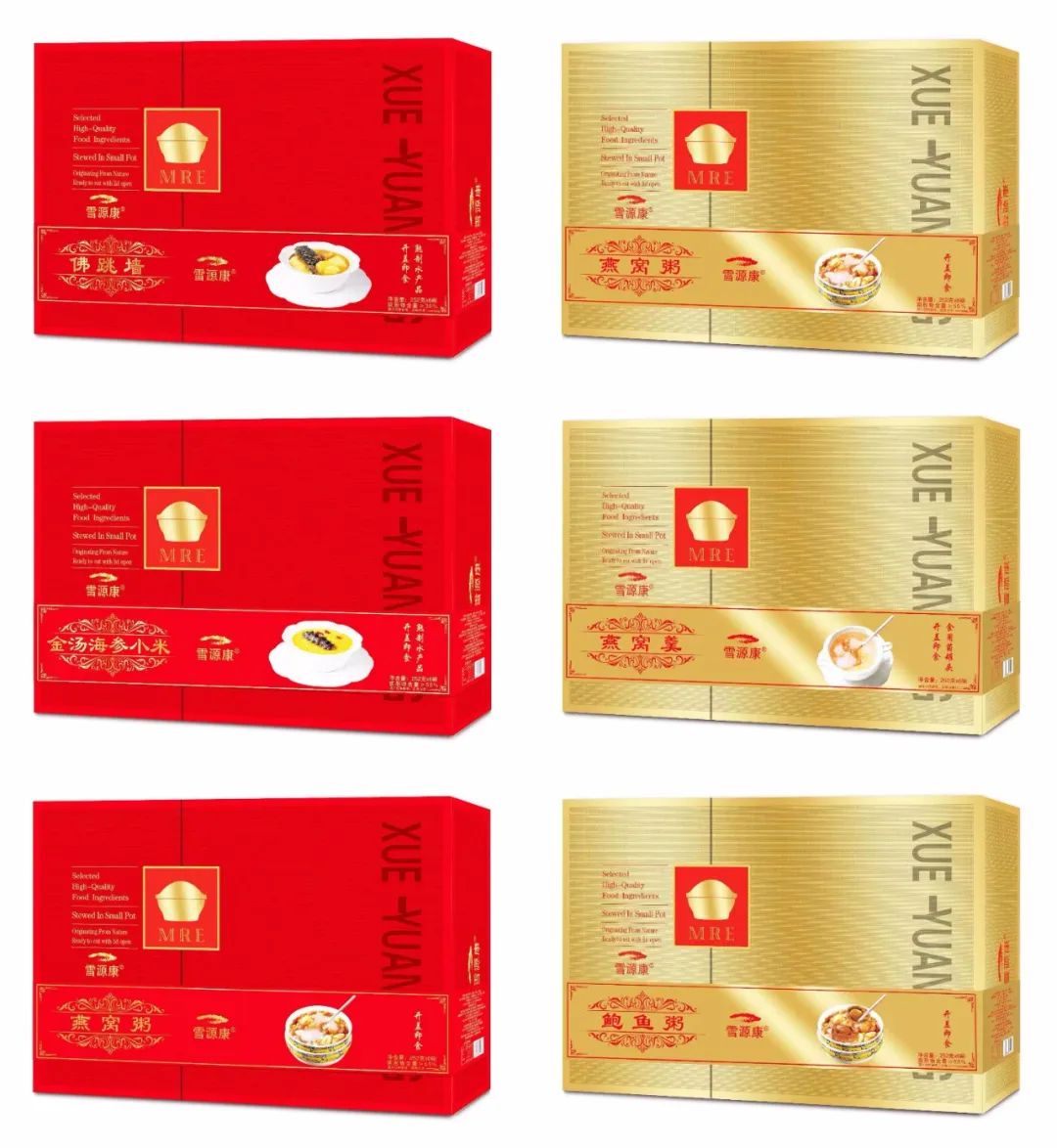 雪源康新品上市,佛跳墙,燕窝羹,鲍鱼粥,燕窝粥、参鲍花胶鸡、金汤海参小米,(金色+红色)两款包装,营养美味又健康。