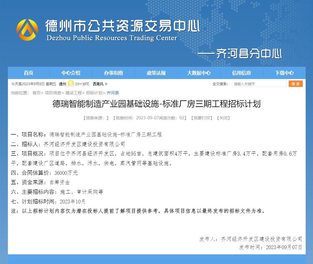 德瑞智能制造产业园基础设施-标准厂房三期工程招标计划,具体情况如下: